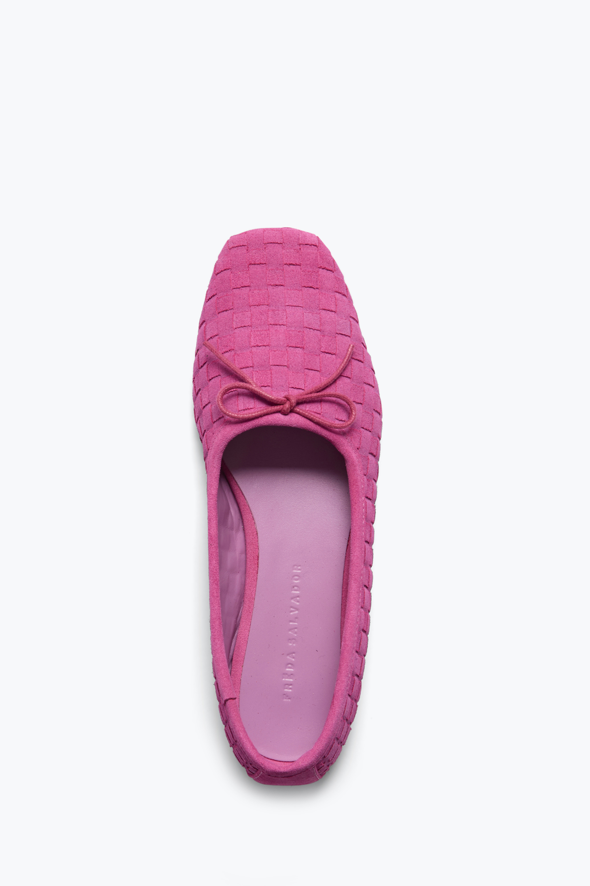 The Jada Ballet Flat in Magenta Suede from FRĒDA SALVADOR is a modern take on a timeless classic. Crafted in rich magenta suede with a woven texture, this woven ballet flat adds the perfect pop of color while maintaining an effortlessly polished look. Designed with a sleek silhouette and feminine bow detail, this comfortable flat shoe is ideal for everyday wear, from workdays to weekend outings.
