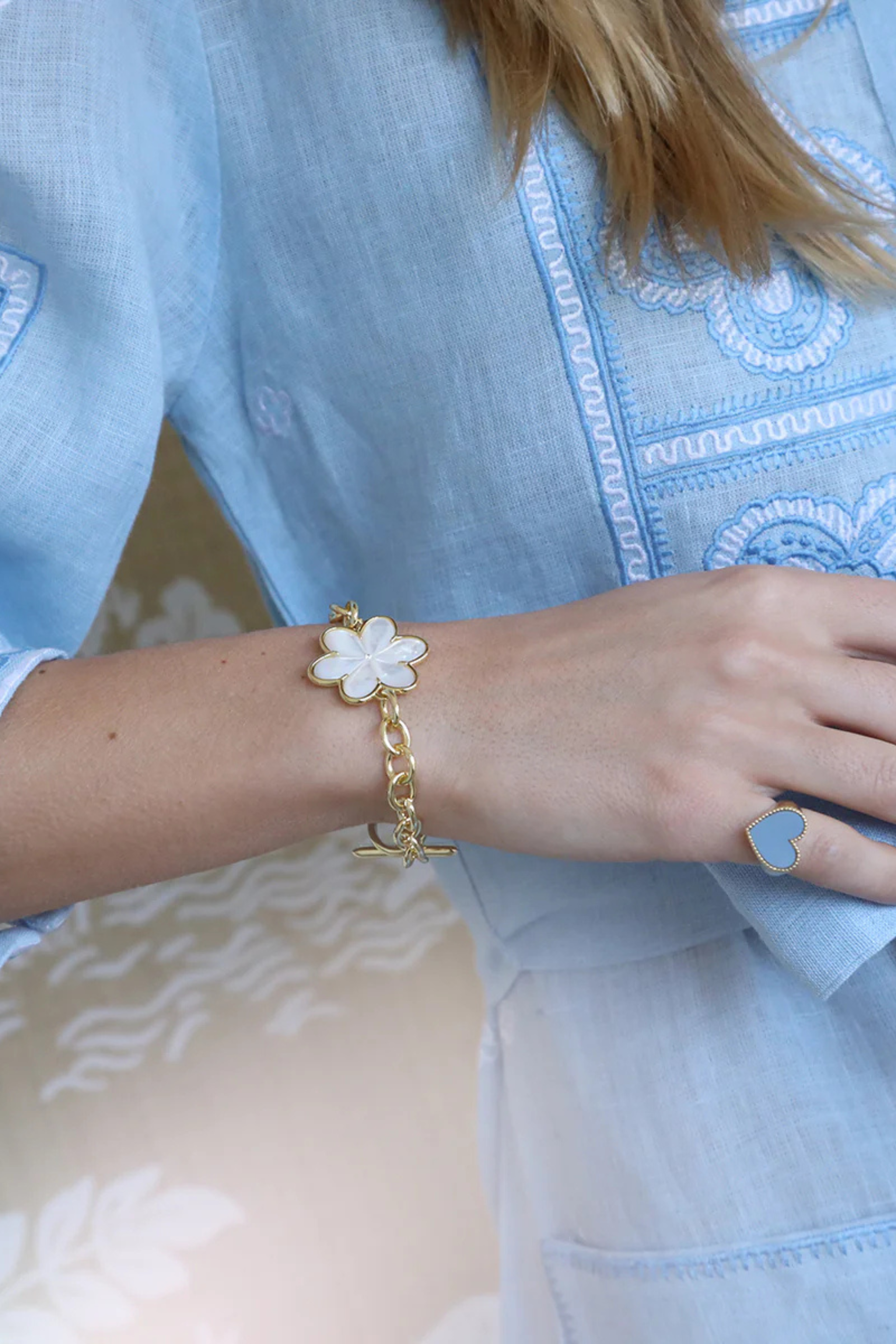 14k gold dipped Eadie toggle bracelet with a mother of pearl flower and cz