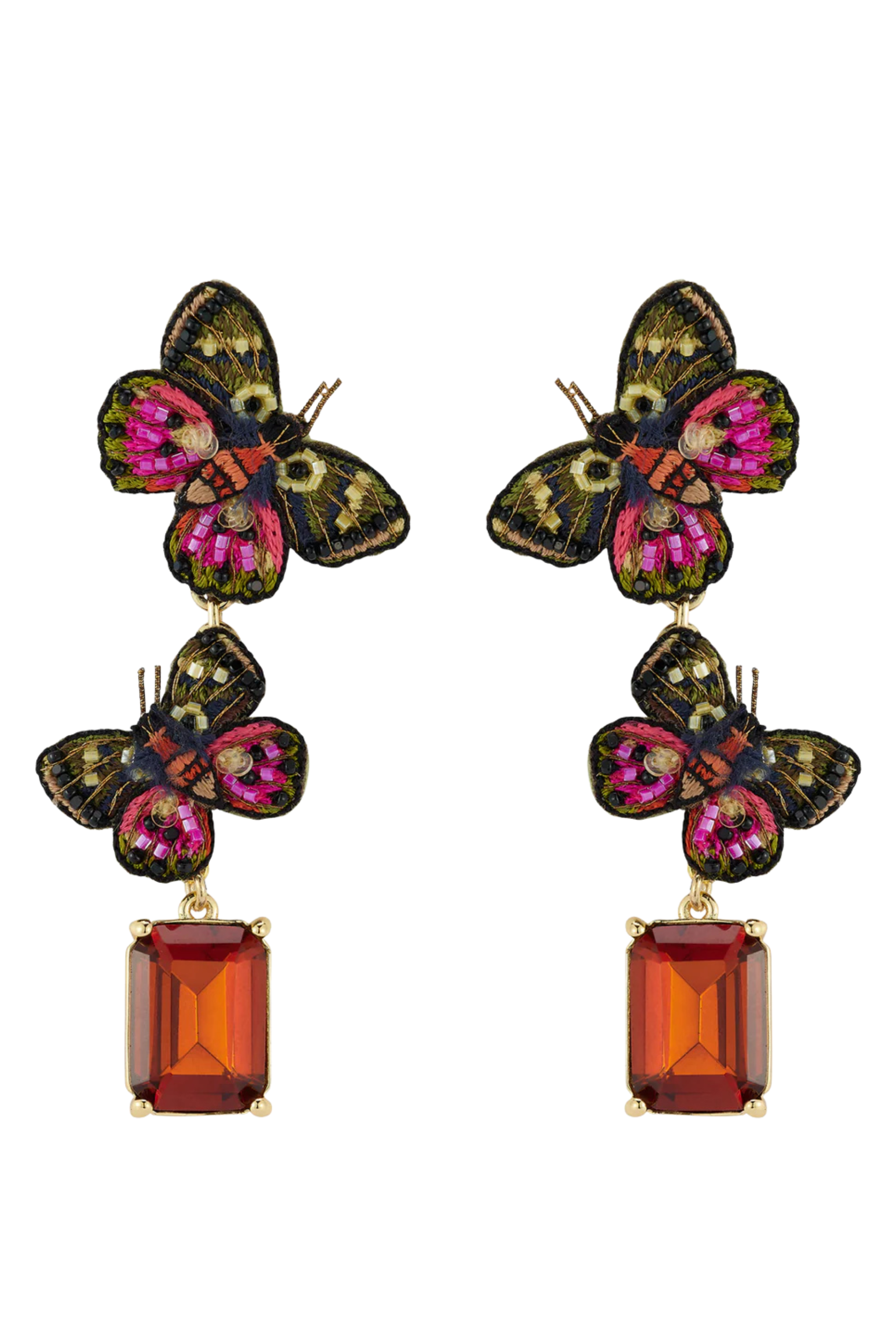 The Luxe Colette Earrings feature intricately embroidered butterflies adorned with sparkling crystals, creating a bold statement accessory. Expertly crafted, these earrings combine delicate detailing with luxurious embellishments for a refined yet eye-catching look. Perfect for elevating any outfit with a touch of elegance and artistry.