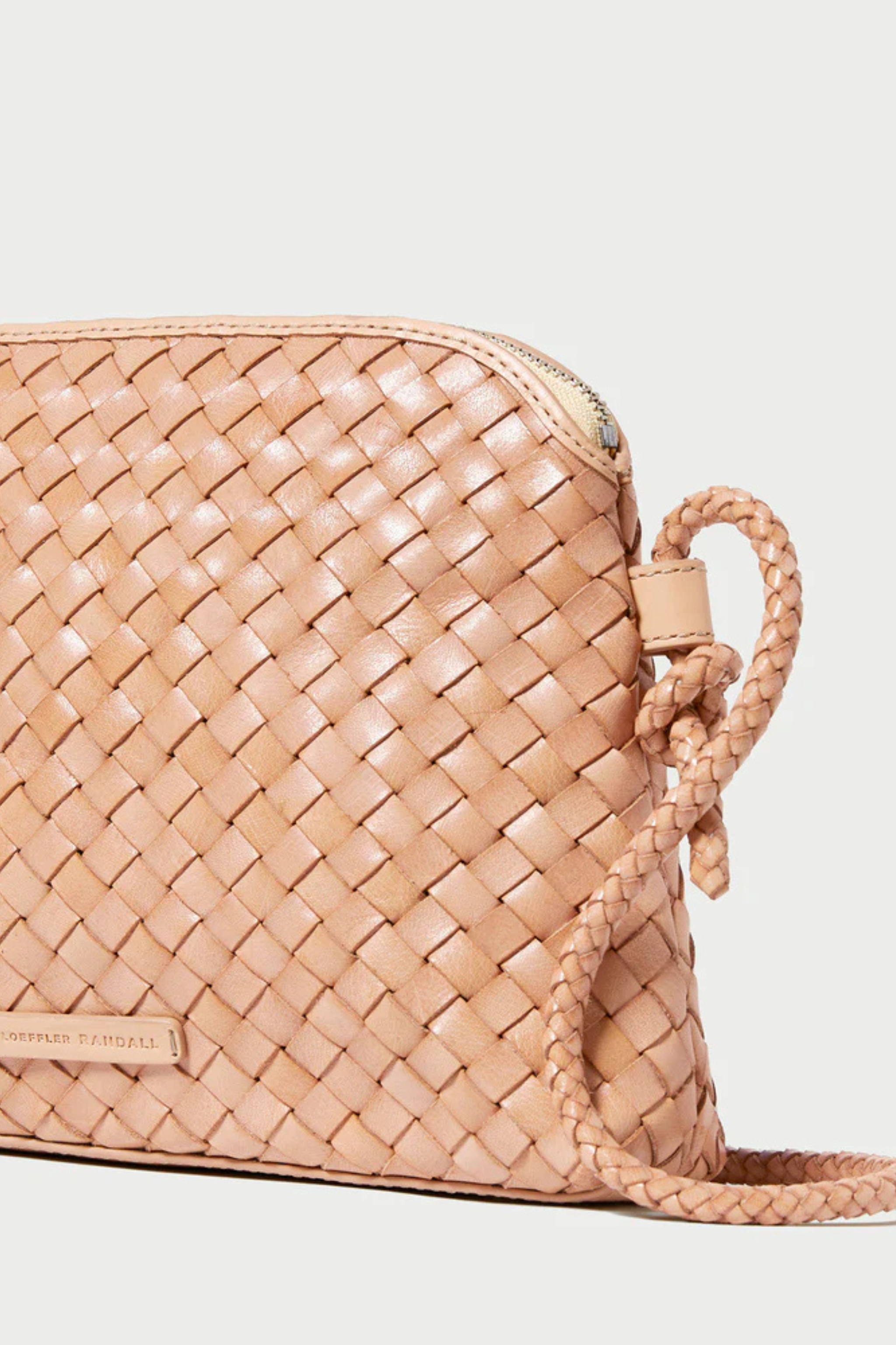 Crossbody bag in desert sand woven leather. Features a zipper closure, cotton lining, an interior pocket, and a stamped logo.