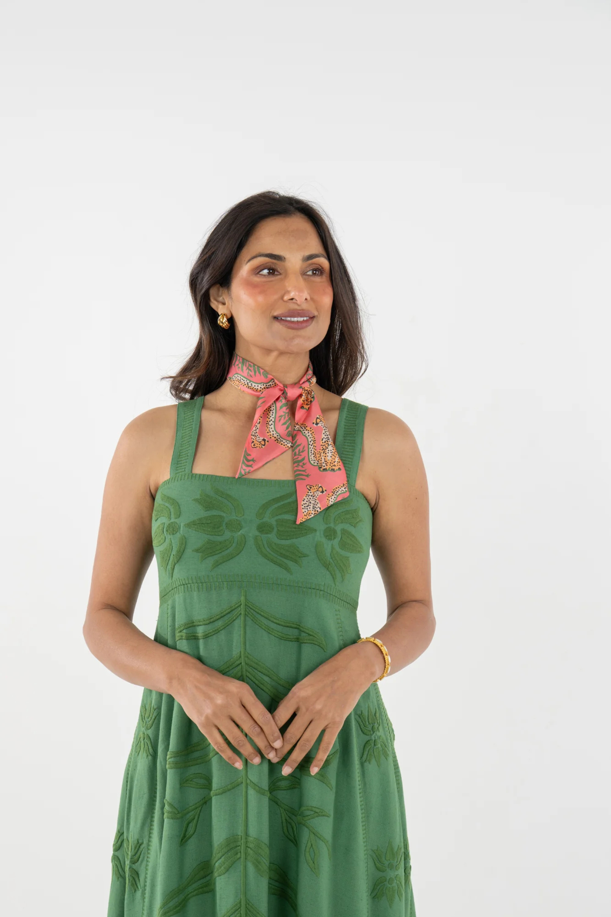 The Scarfette in Cabana Cat is an easy, elevated accessory crafted in luxurious 100% silk. The Cabana Cat print blends feminine and fierce energy, featuring cheetahs symmetrically framing lush green florals. Versatile and polished, it can be styled tied at the neck, wrapped around a bag strap, or worn as a chic hair accessory for a playful finishing touch.