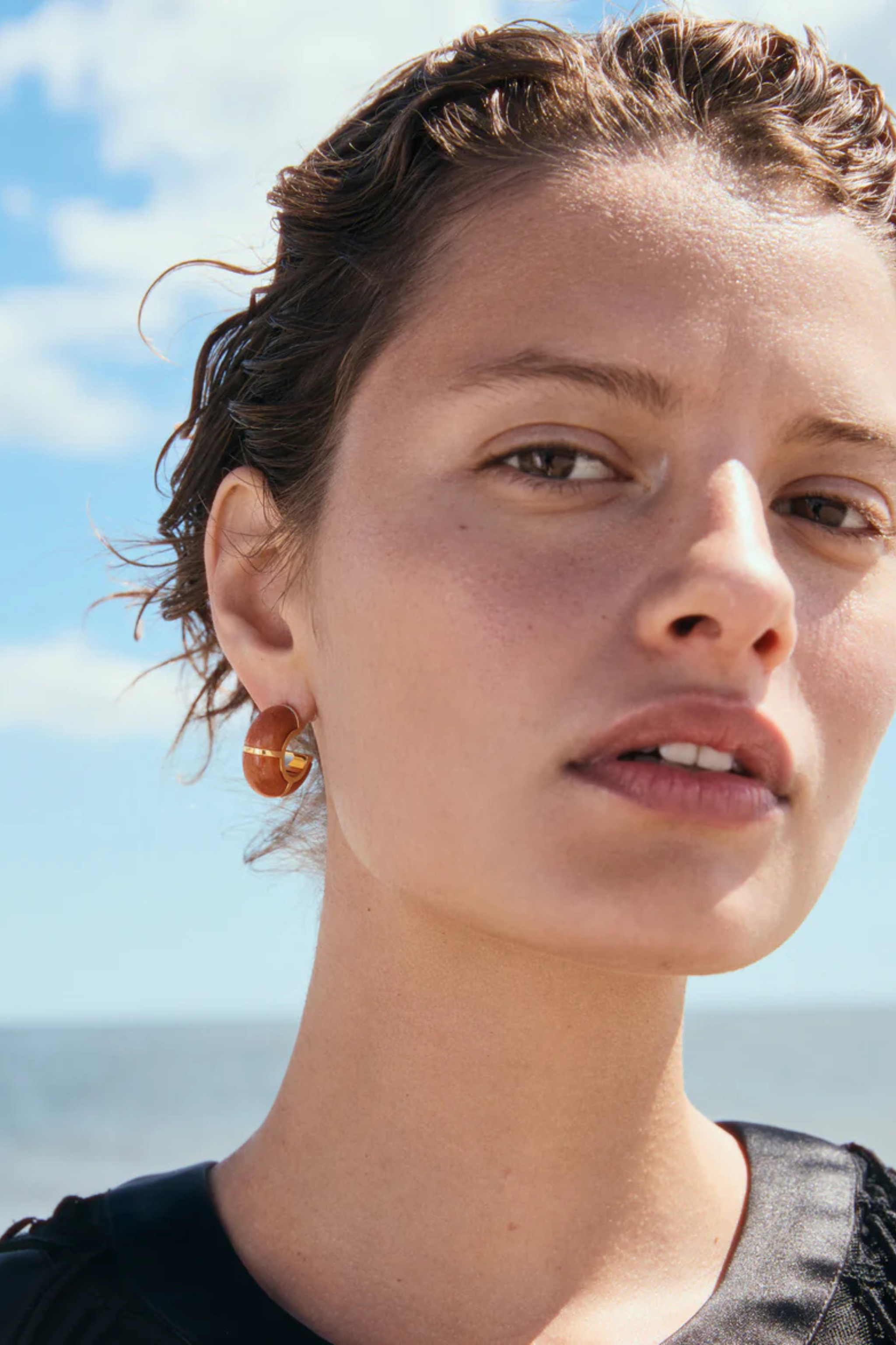 Style these peach stone hoop earrings with linen sets or soft neutral outfits.