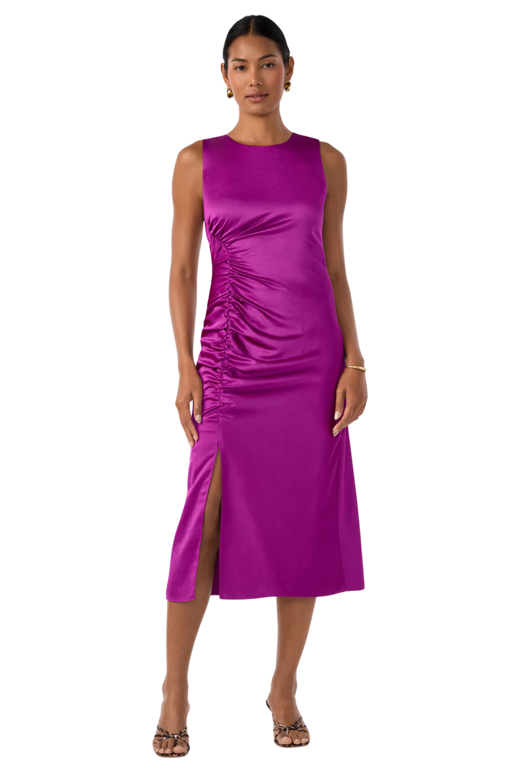 This fitted satin dress features a bold fall hue that will stand out at every elevated event this season. Its slim silhouette and shirring accent give this cocktail dress a flattering fit. This sleeveless dress features a midi length, crewneck, and side slit. It is made of lightweight, drapey satin with a beautiful sheen, making it a year-round essential dress.