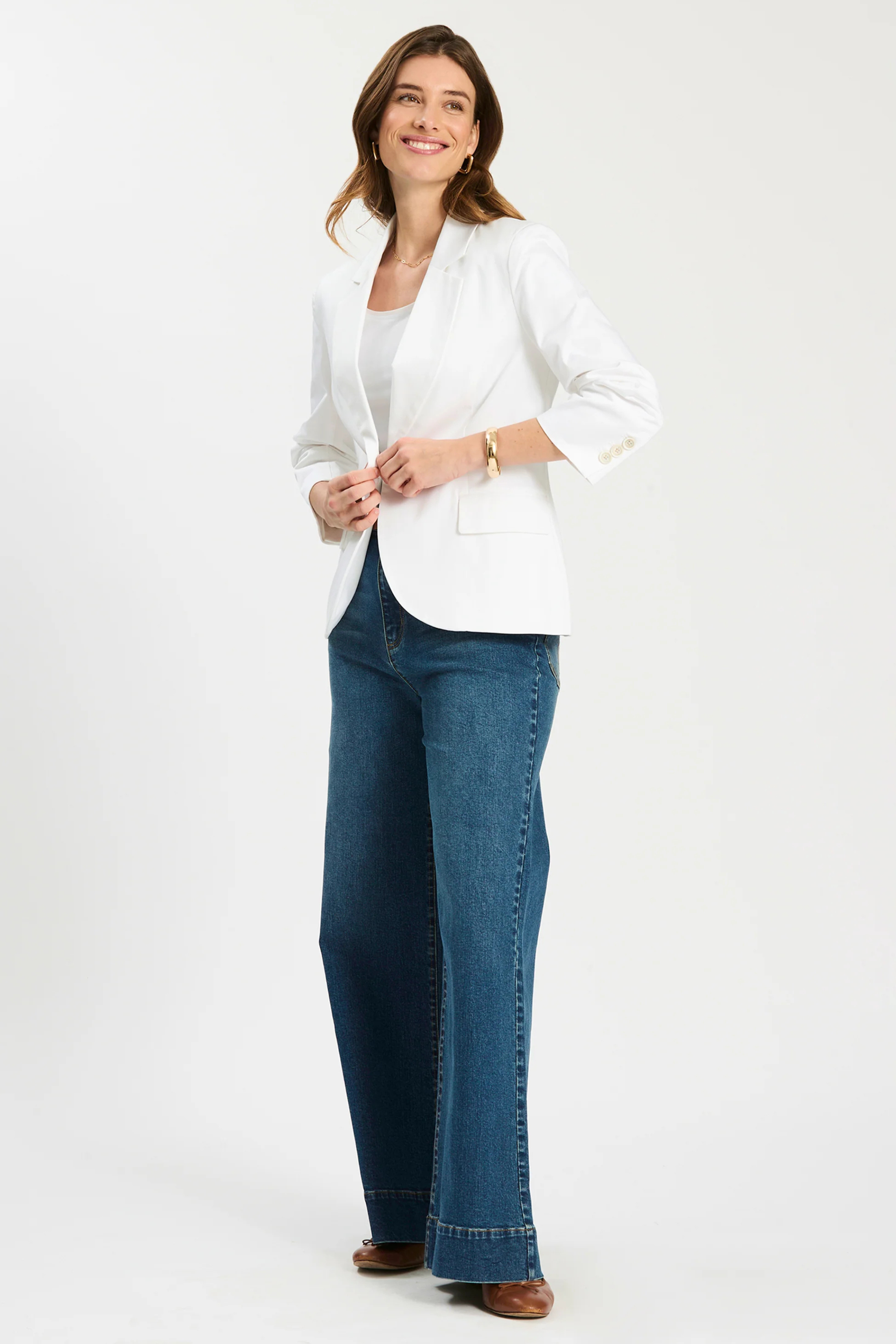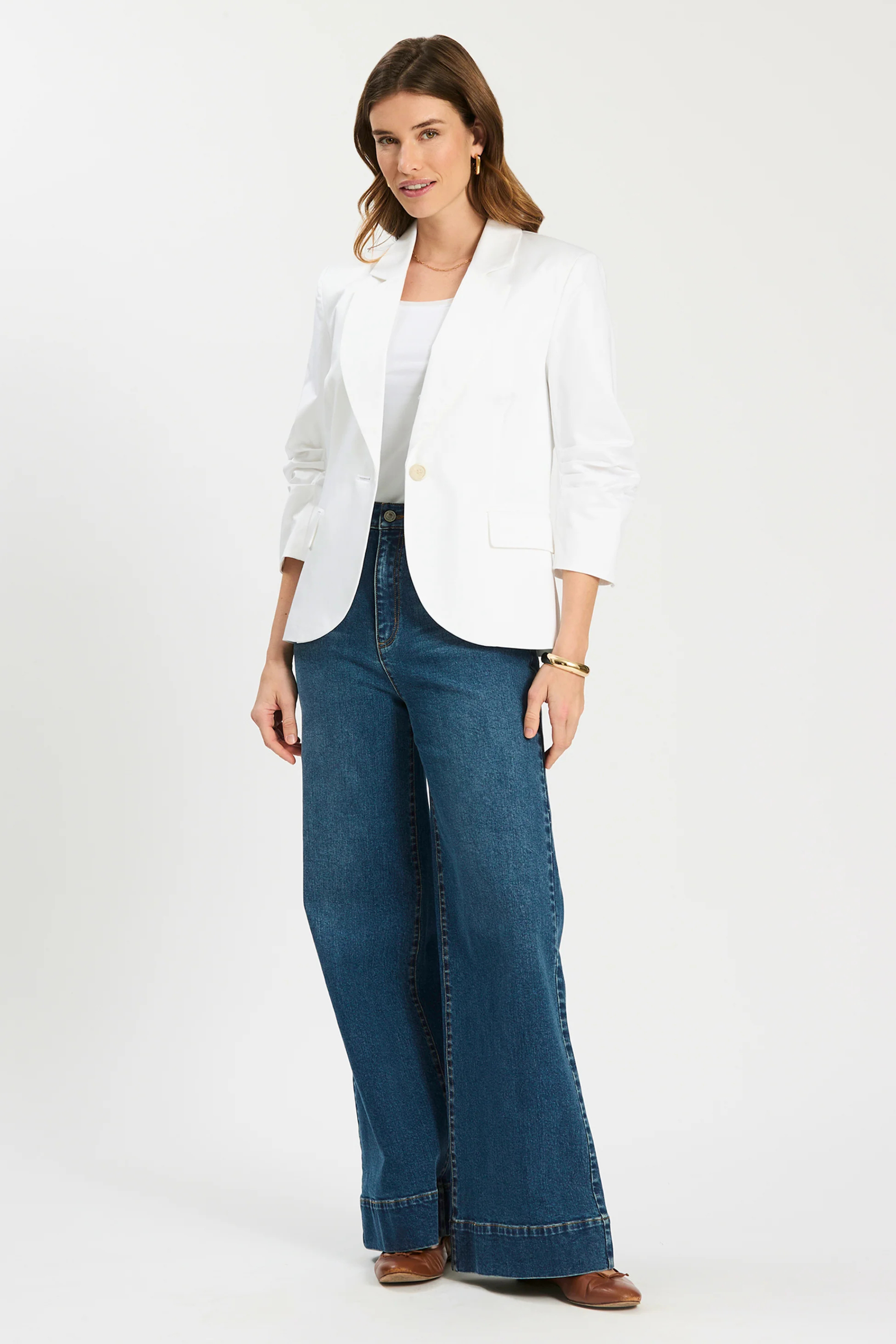 Suit up for spring: the Taylor Blazer brings a classic tailored look with warm-weather ease. Designed with a notch collar, single-breasted button front, and three-quarter ruched sleeves, it layers effortlessly over tees, dresses, and everything in between.