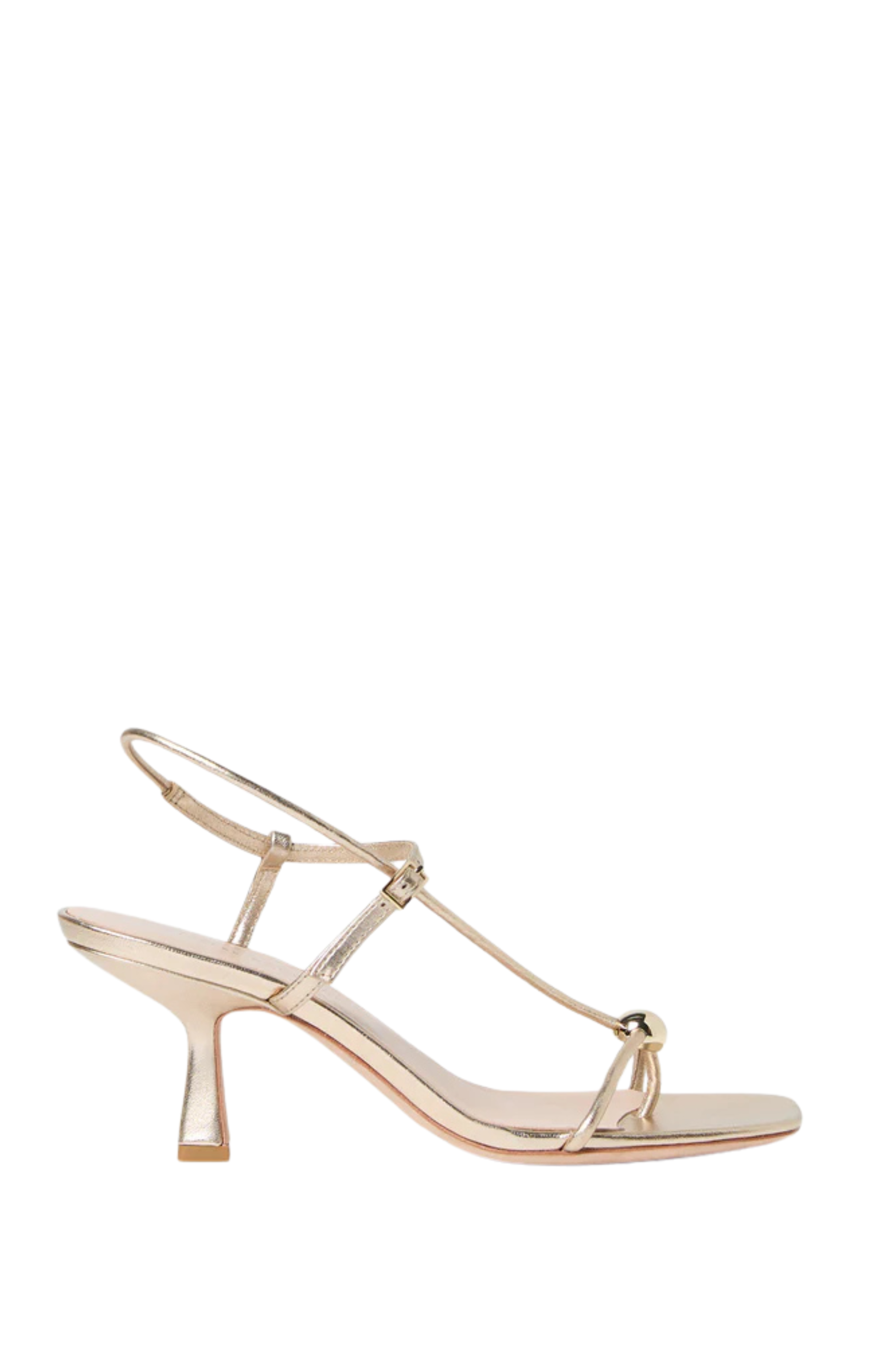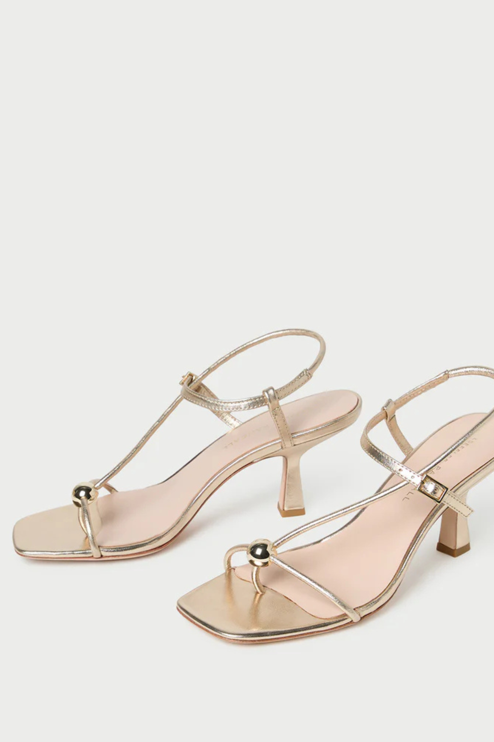 Mid-heel sandal in champagne metallic nappa leather. Features a delicate strappy design, gold ball detail, an open toe, and a padded footbed with gold stamped logo. 2.75-inch heel.