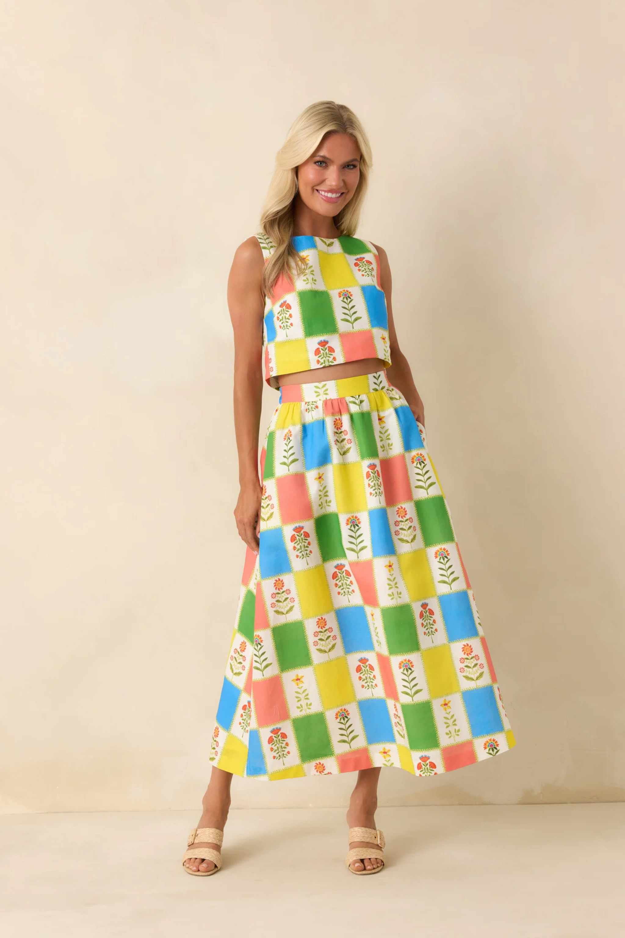 The Ellie Top in Petit Fleurs Print by Prosperina is a fresh, feminine piece designed to make a statement. Featuring a vibrant patchwork of colorful squares and delicate floral motifs, this cropped silhouette feels equal parts playful and polished.