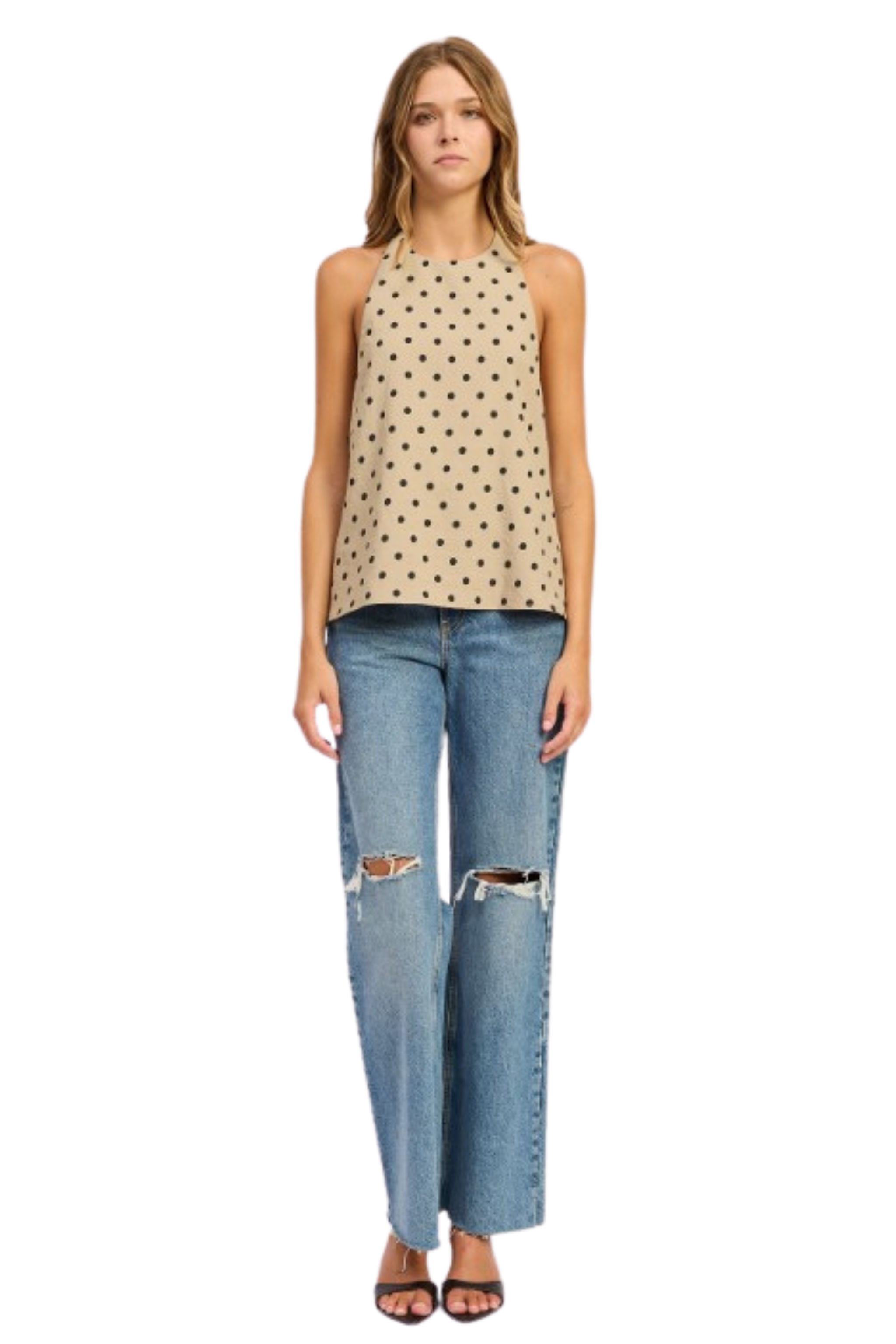 Timeless with a playful twist, the Hadley Top by En Saison in Tan Black is an effortlessly chic piece you will reach for again and again. Featuring a flattering halter neckline and classic polka dot print, this elevated statement blouse adds a touch of sophistication to everyday dressing. The lightweight silhouette makes it perfect for warm weather styling, whether you are heading to brunch, a casual dinner, or pairing it with denim for an easy weekend look.