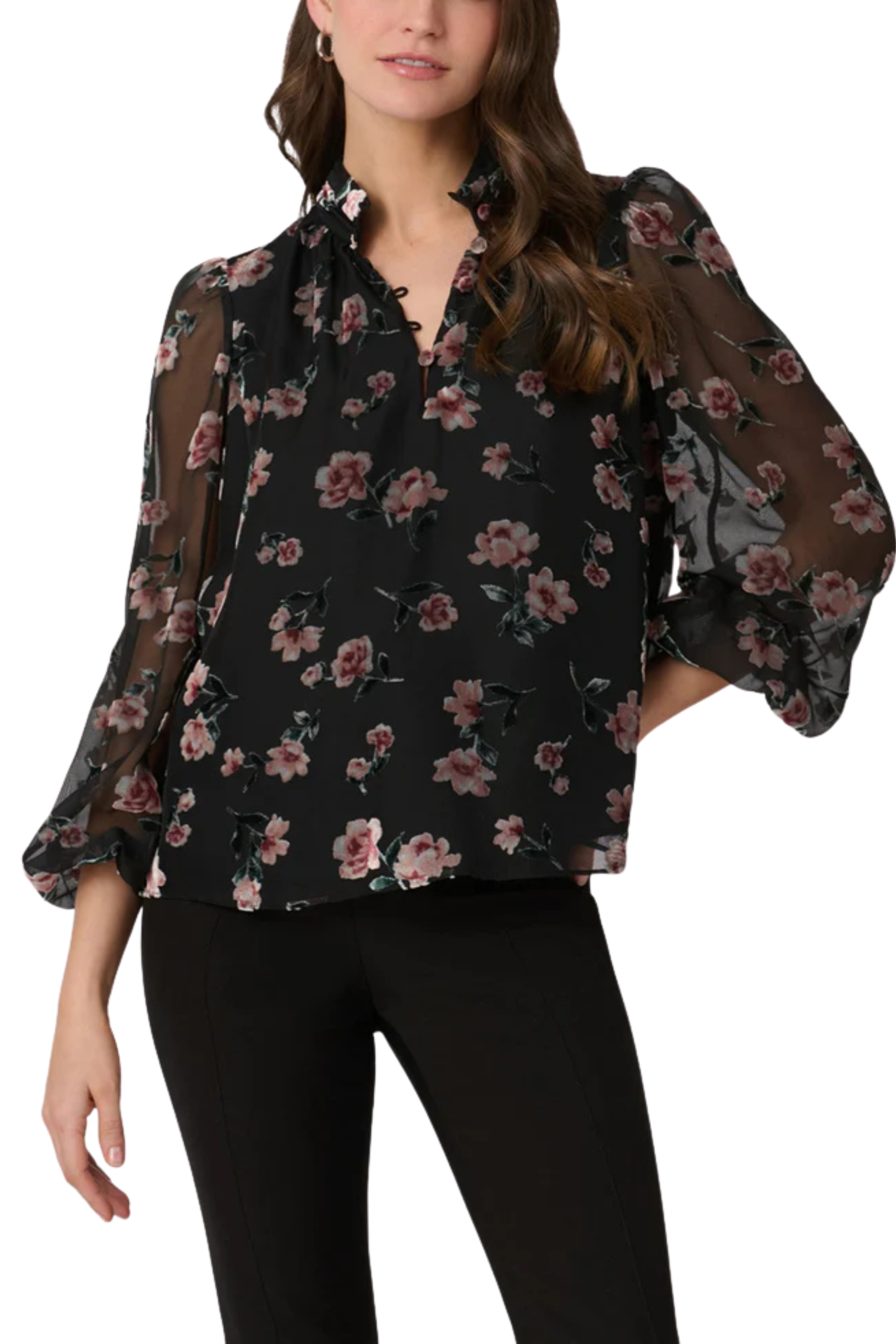 This fabulous burnout velvet top features a ruched collar and a front slit with covered buttons and loops. Buttons are functional and can be closed or left open for desired styling. The body is lined, and the sleeves are unlined for a sheer effect. Sleeves have elastic at the opening, and the hemline is slightly curved to give a nice shape to the body.