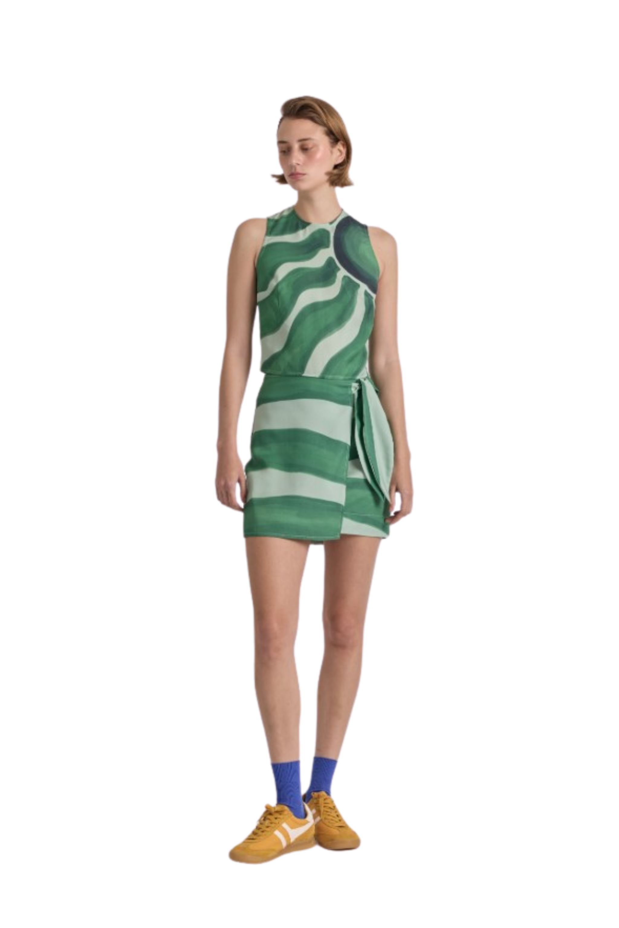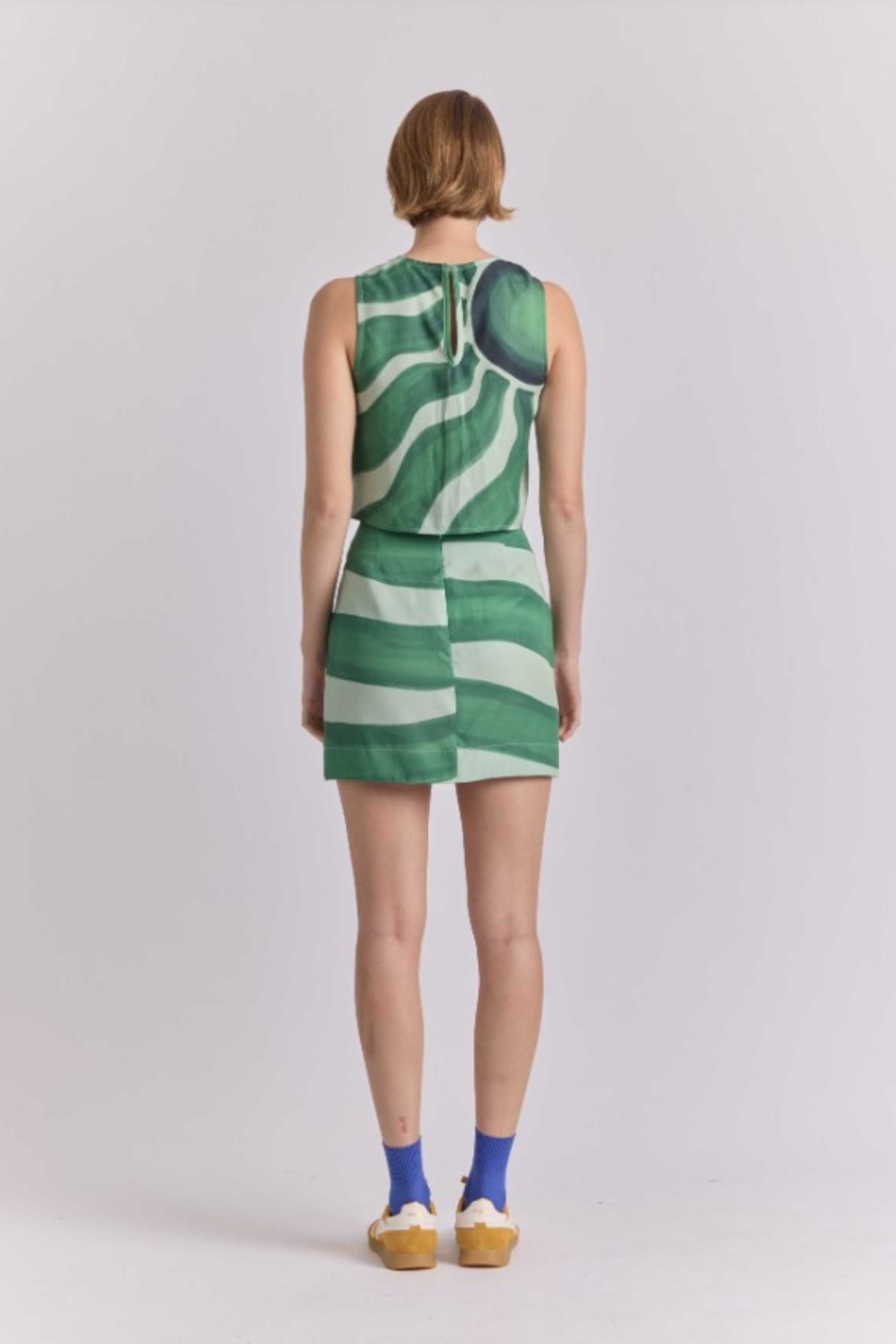 Modern, bold, and effortlessly chic, the Pasca Top in Rayos from De Loreta brings a fresh statement to your warm weather wardrobe. Featuring the brand’s striking Rayos print in vibrant shades of green, this sleeveless top blends artistic pattern with a sleek, tailored silhouette. The high neckline and clean lines create a polished look that works beautifully for daytime outings, vacation styling, or elevated casual moments. Whether worn on its own or paired with the coordinating skirt, this statement top delivers standout style with ease.