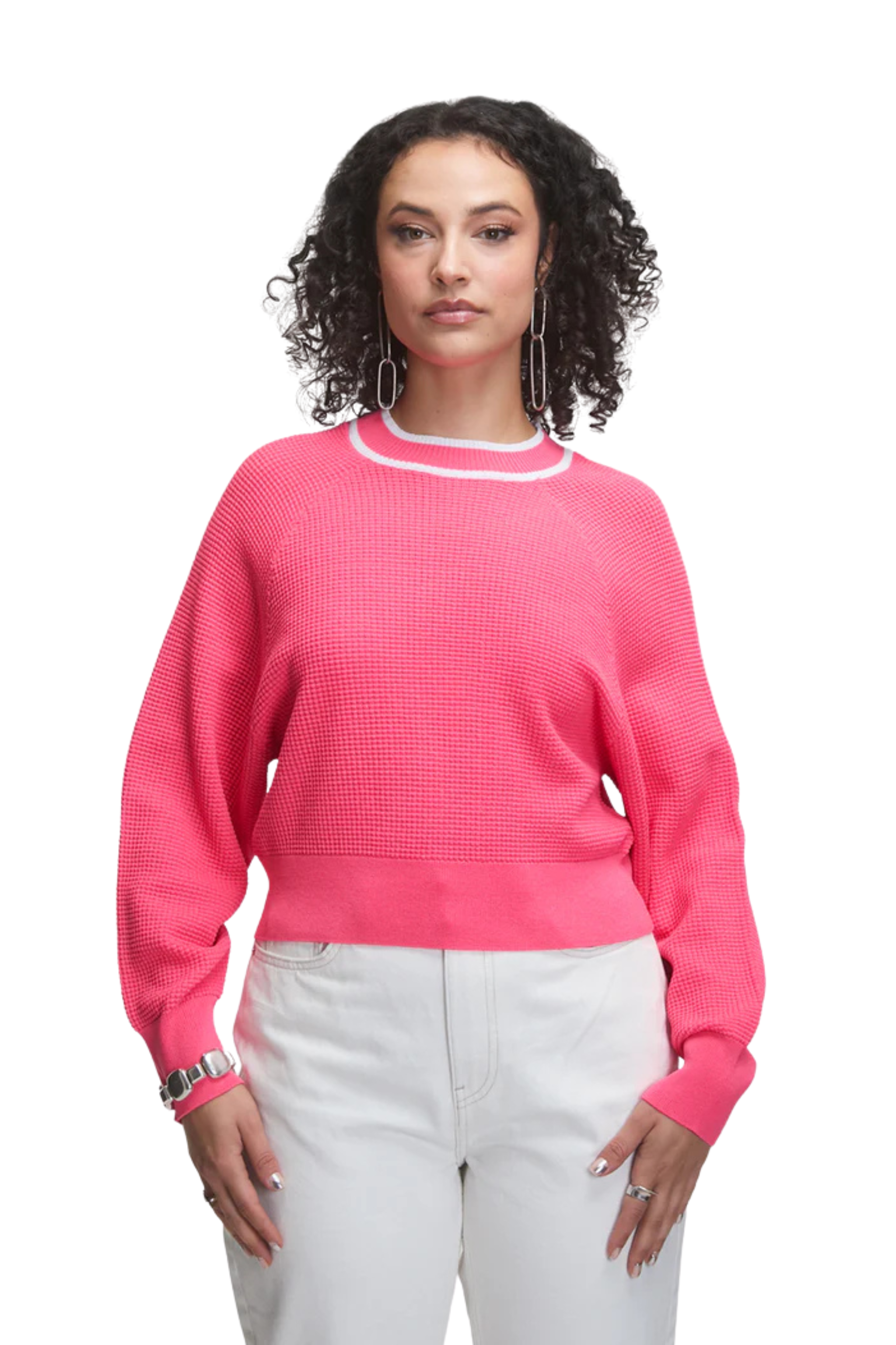 Crew neck long sleeve dolman top in waffle stitch with contrast piping detail.