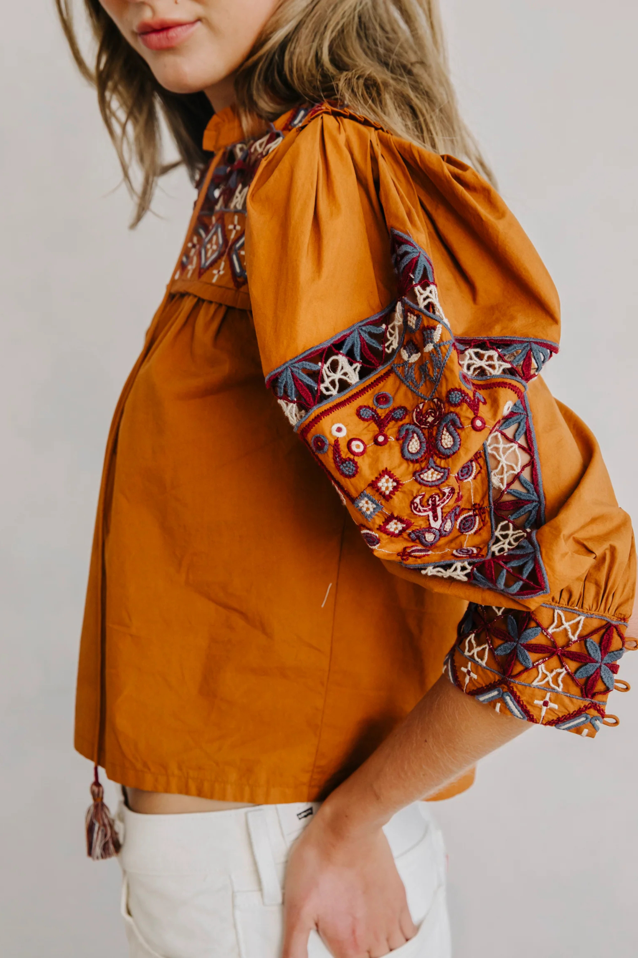 The Diella Top in Caramel is a standout piece with intricate embroidered details across the yoke and puff sleeves, finished with tassel ties for a touch of bohemian charm. Crafted in a rich caramel hue
