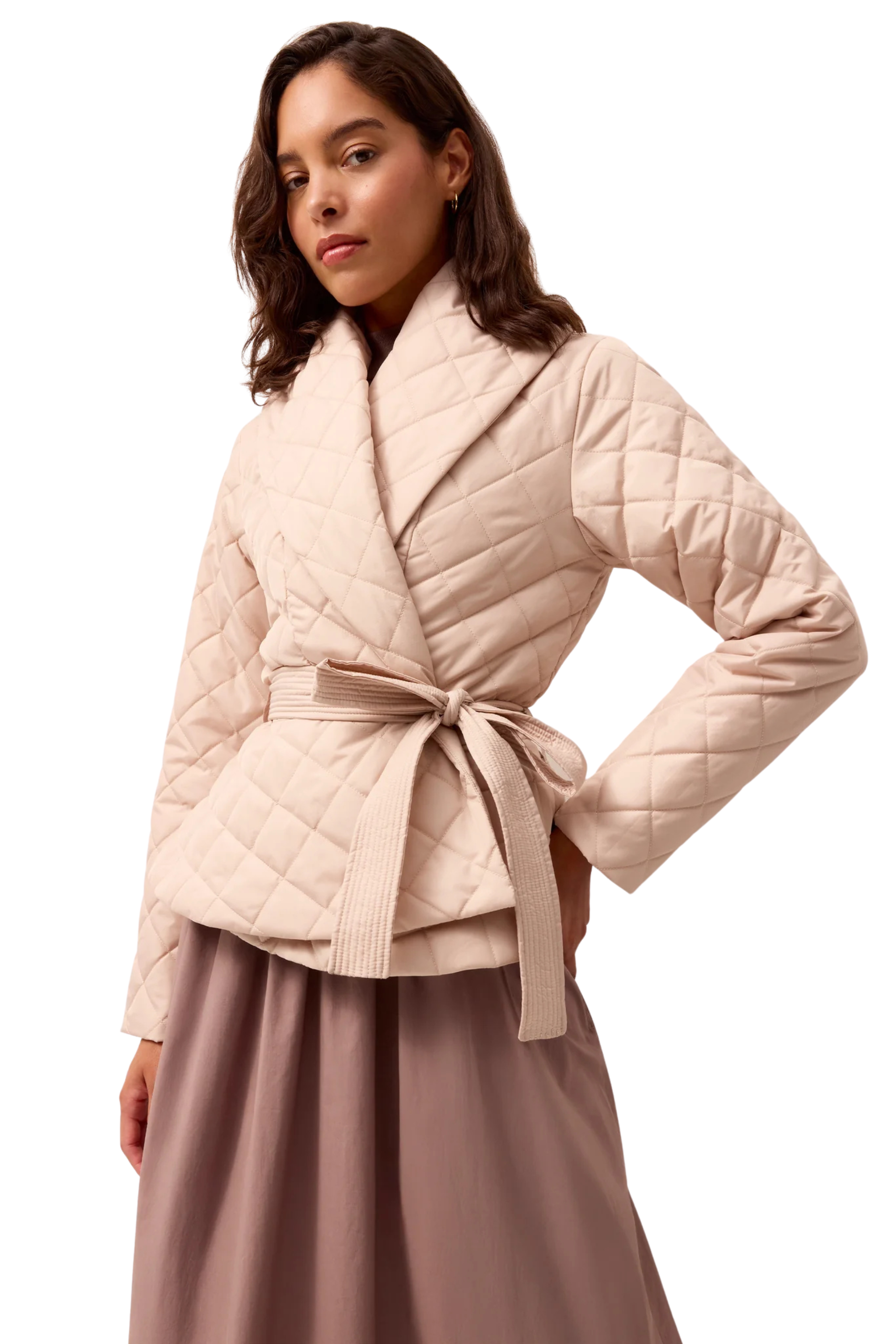 A ladylike quilted jacket never goes out of style, and the Lark effortlessly exudes sophistication while exhibiting form and function. A shawl collar wrap front is paired with a trapunto stitch tie belt and cropped hem for a modern reinvention of a classic wrap coat.