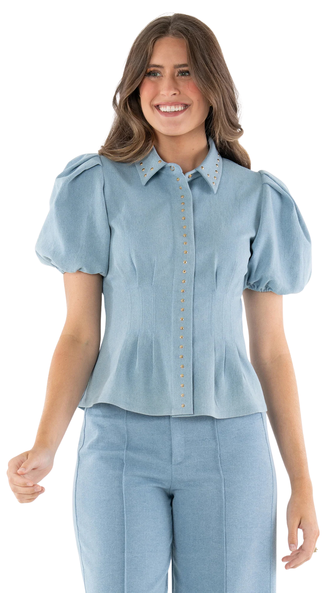 The Britt Top redefines denim with a feminine edge. Featuring a classic fold collar, puff sleeves with elastic cuffs, and a lightly boned bodice, this style offers both structure and ease. A concealed front button closure is framed by a gold-studded panel, adding a subtle western-inspired detail. Crafted in stretch denim, it flatters the figure while providing comfort, making it as timeless as it is on trend.