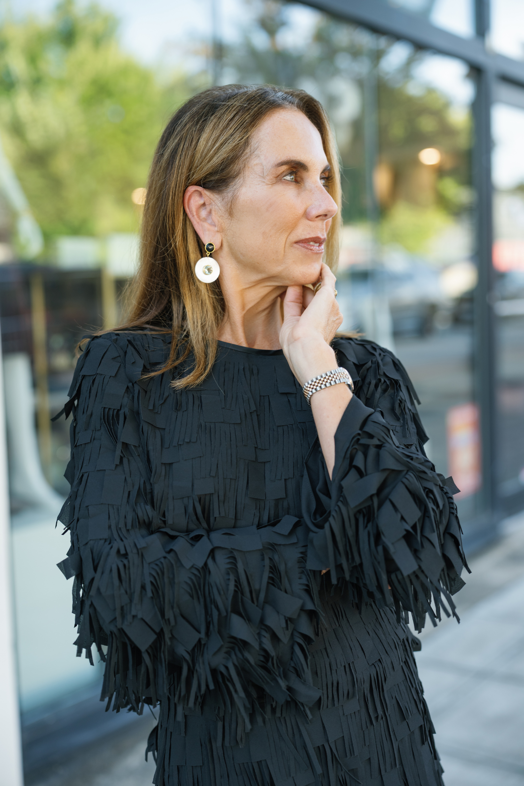 Add some dimension to your look with this moody top made of chiffon that has been sheared and layered to create geometric fringe. This boatneck top is finished with bracelet-length sleeves and a center back button and loop closure. Wear it with the matching skirt for a complete look.