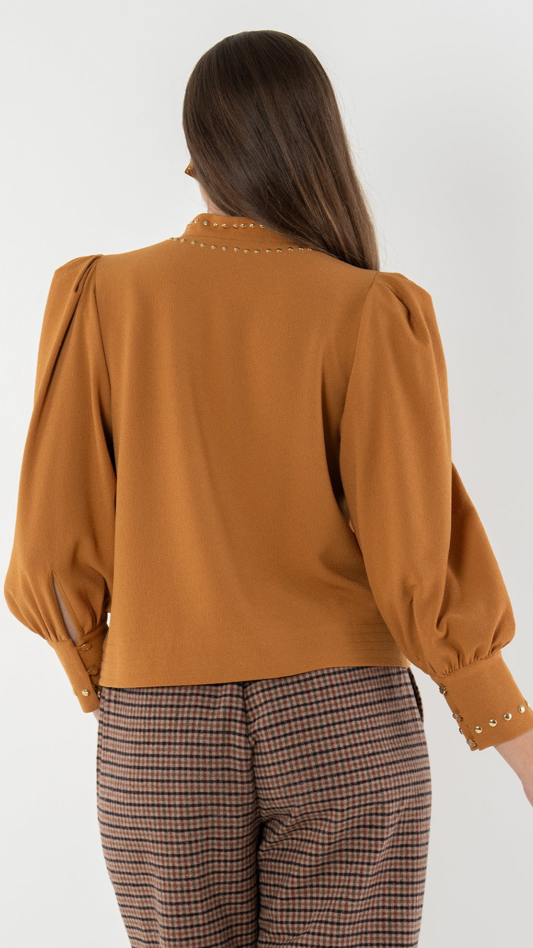 The Hampton Top in Brown Sugar brings a refined edge to everyday dressing. Featuring blouson sleeves with cuffed finishes and a flattering V-neckline, this silhouette is elevated by gold stud detailing along the neckline and wrist cuffs. The subtle western chic style adds a nod to Texas roots, while the warm tone and timeless cut make it a versatile piece for seasonal transitioning.