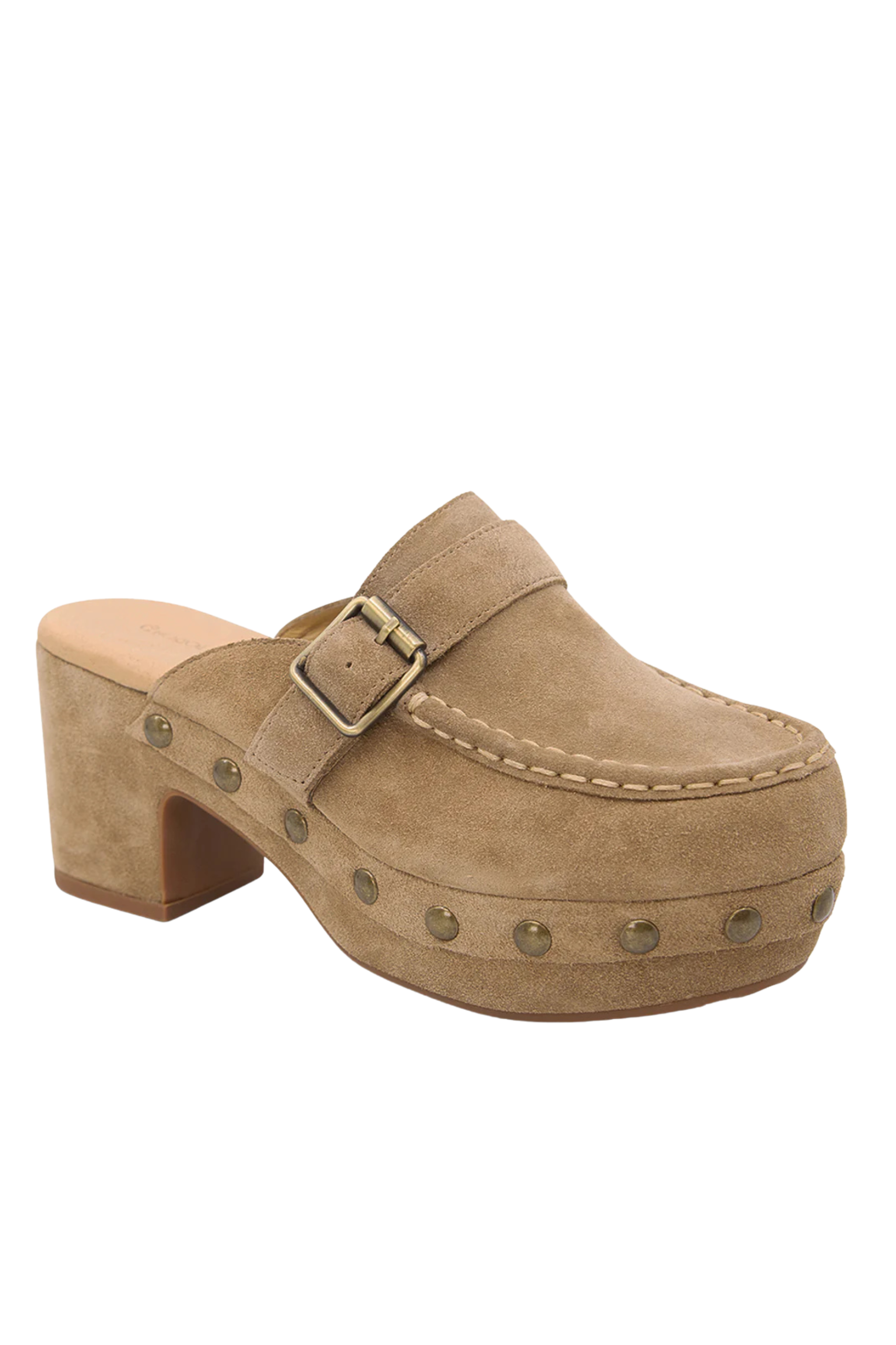 The Genni platform mule boasts a suede upper accented with studs and a belt detail. It features a padded footbed for enhanced comfort and is expertly crafted in Brazil.