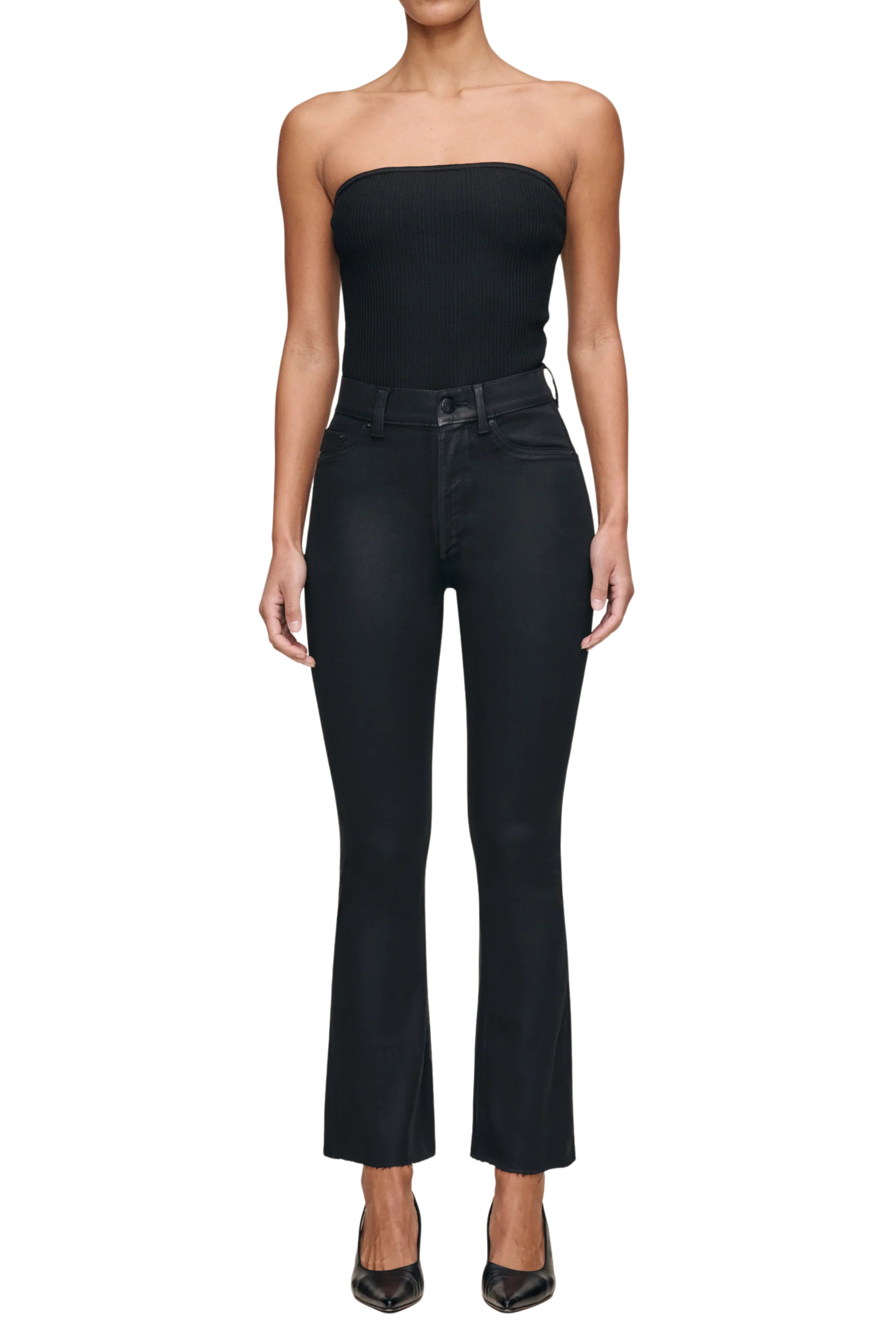 Bridget is a high-rise, cropped boot cut fit that utilizes DL1061's Instasculpt technology to smooth, sculpt, and conform to your body for the perfect fit. Black Coated is a wax coated, true black denim with a leather-like look. It features black oxide hardware, tonal stitching, raw hem and a black back patch.