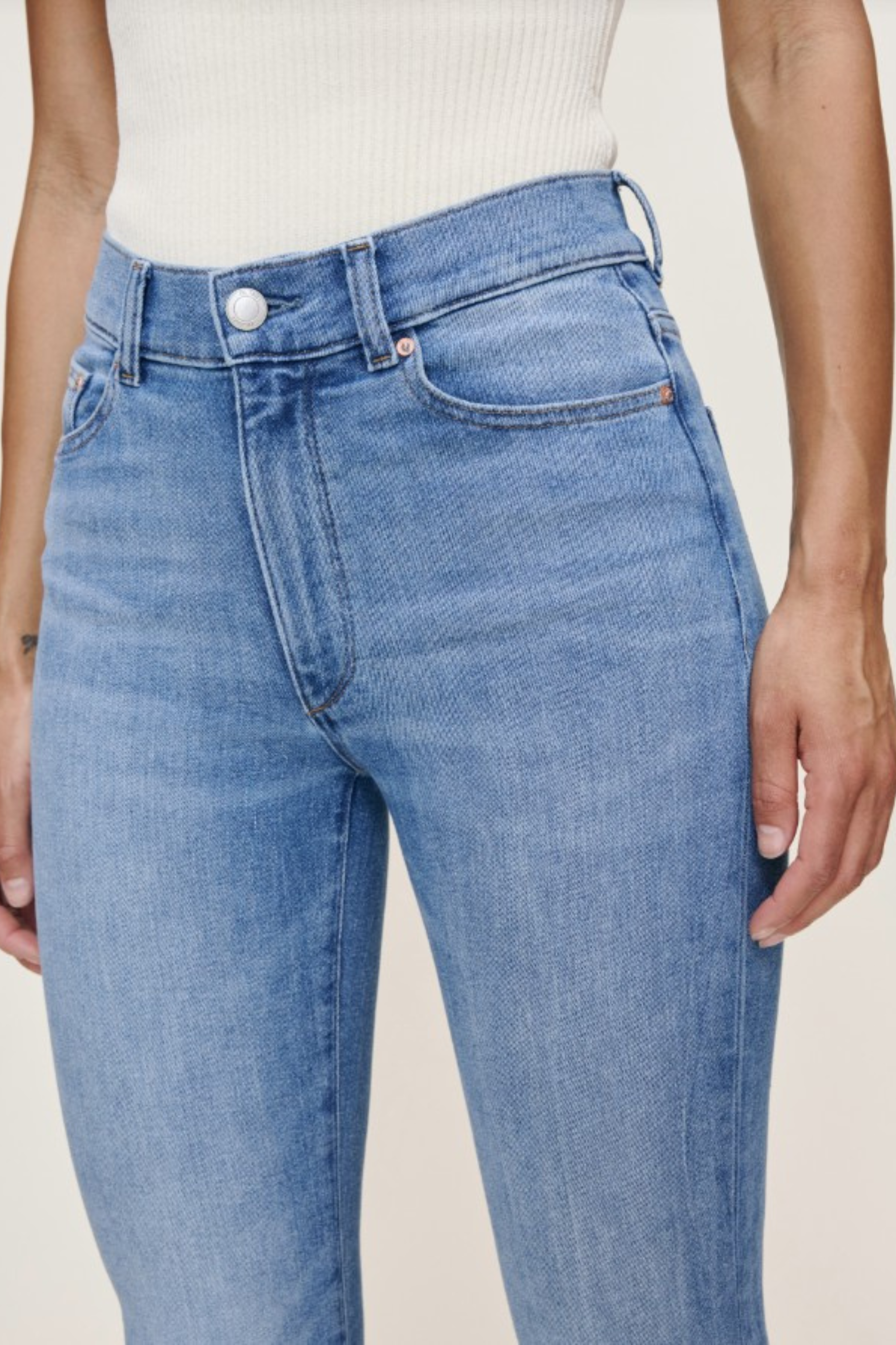 Bridget is a high-rise, boot cut fit with a 31.5" inseam that utilizes our Instasculpt™ technology to smooth, sculpt, and conform to your body for the perfect fit. Spring Creek is a bright, mid indigo denim with authentic character. It features a silver shank, copper rivets, khaki stitching, a clean hem and an ecru back patch.
