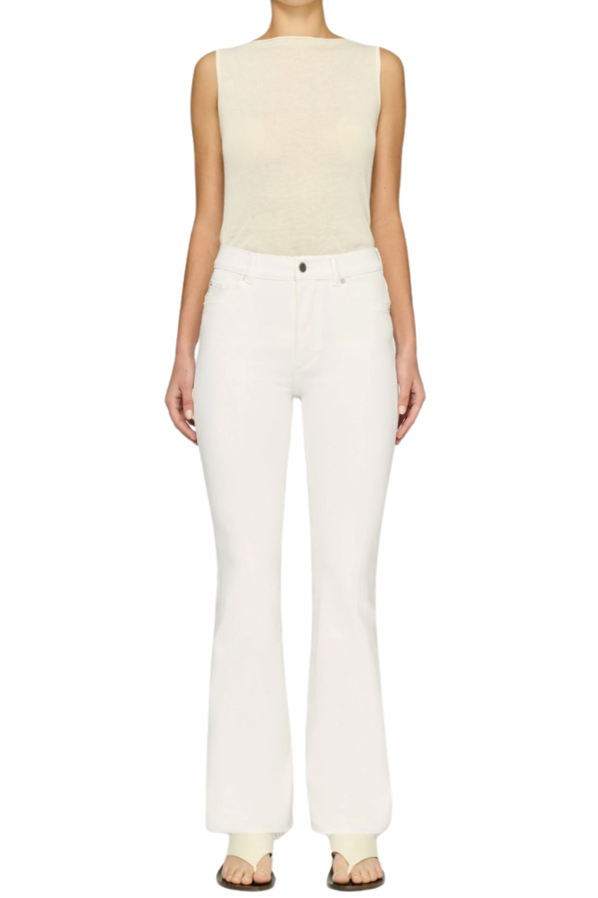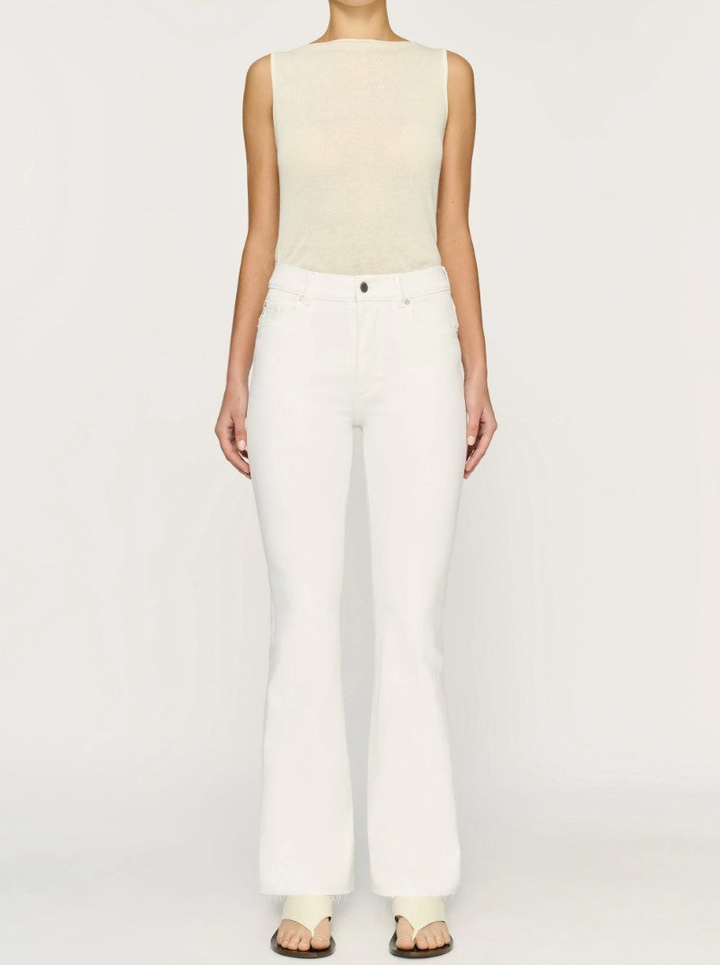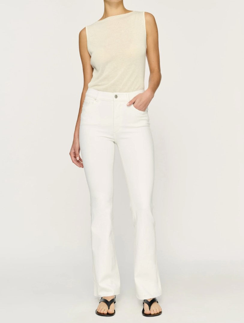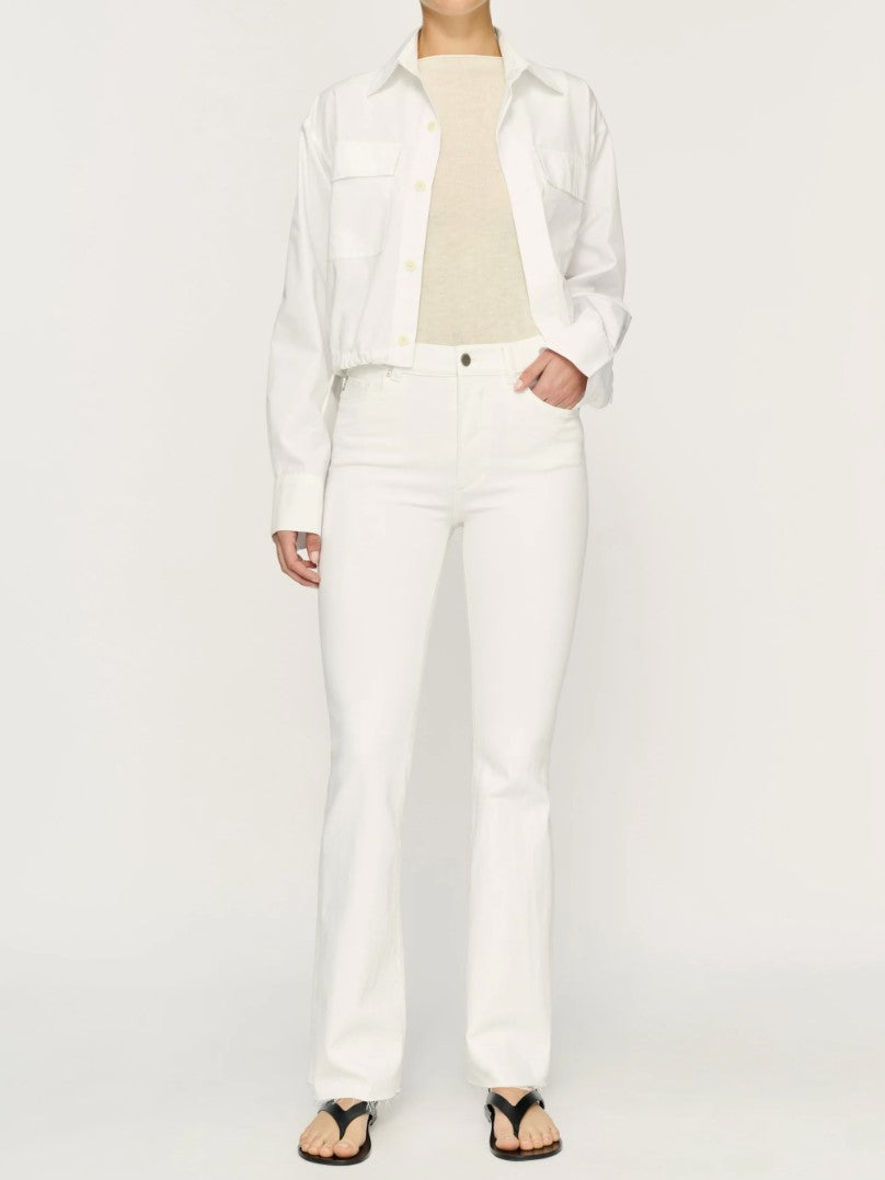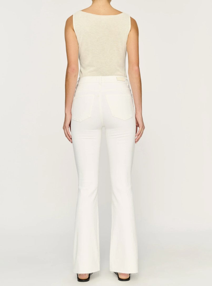 Bridget is a high-rise, boot cut fit with a 31.5" inseam that utilizes our Instasculpt™ technology to smooth, sculpt, and conform to your body for the perfect fit. White is a fresh clean denim. It features brushed faux front pockets, silver hardware, tonal stitching, a raw hem and an ecru back patch.