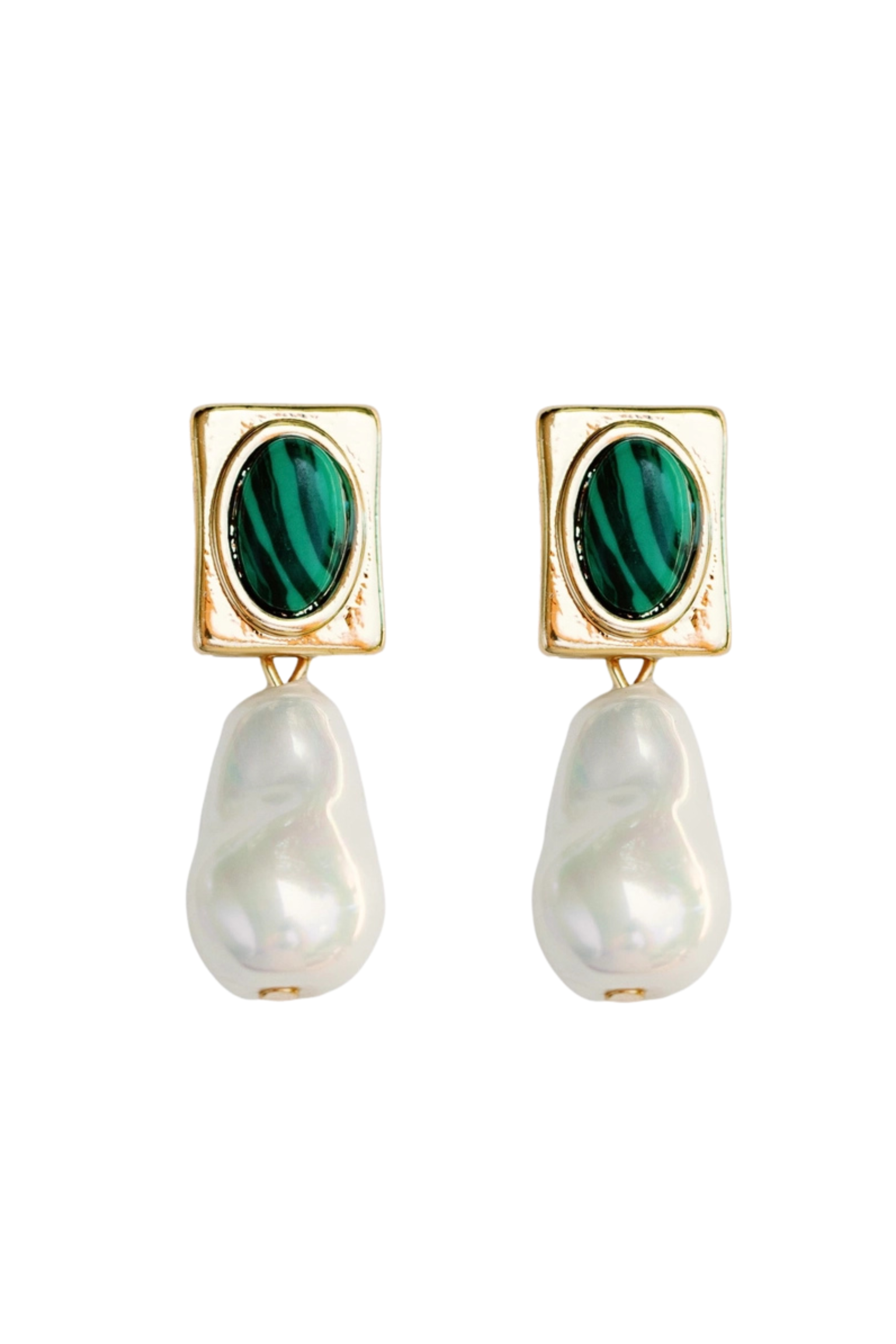These 2” earrings feature a lustrous faux natural pearl nestled on an elegant malachite base. The deep green malachite works for all seasons, but we especially love them for fall and holiday.