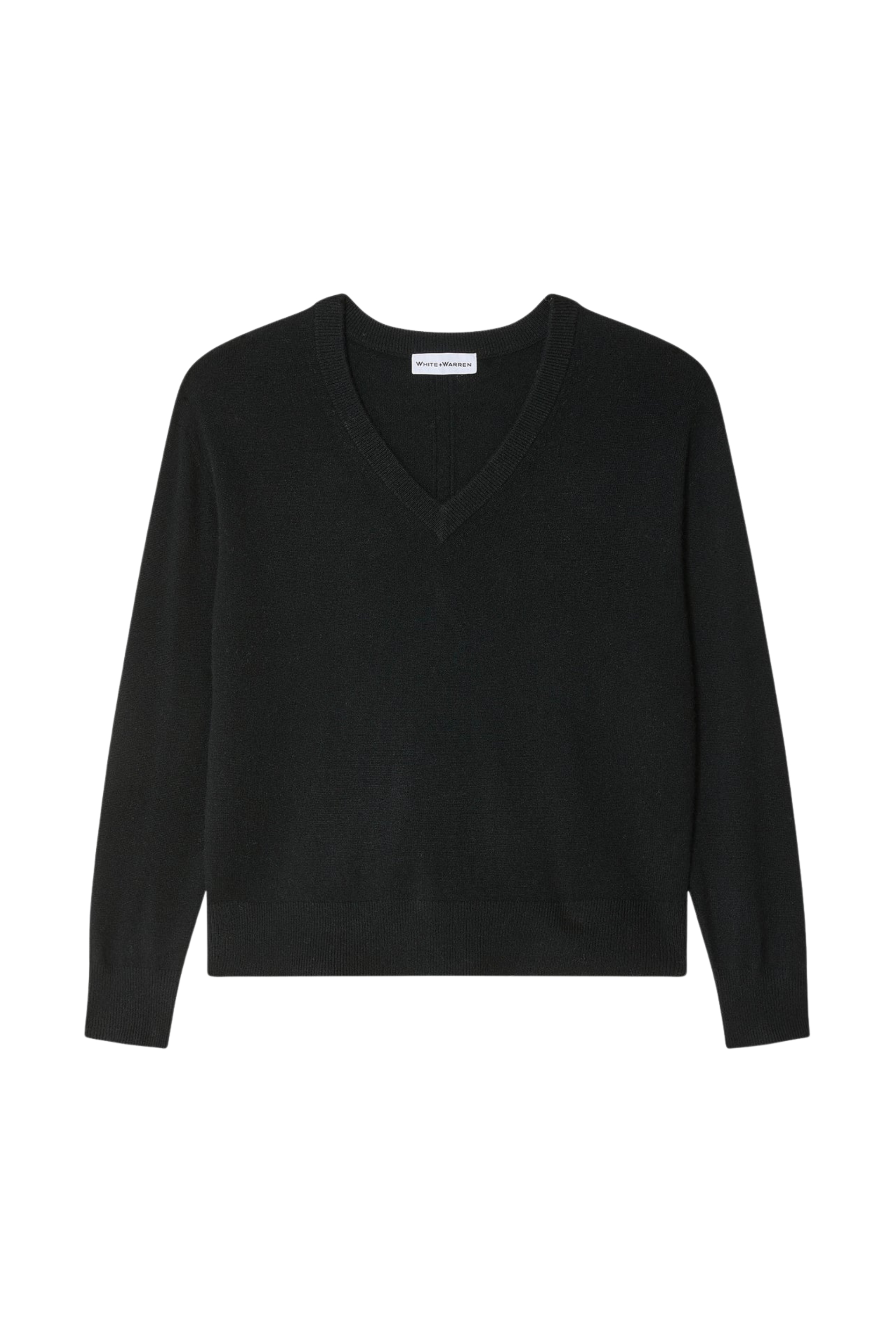 The effortless essential. Knit from 100% cashmere, this sweater boasts a flattering V neckline, neatly ribbed trim, and center-back detail. Relaxed with a longer length, size down for a slimmer fit.