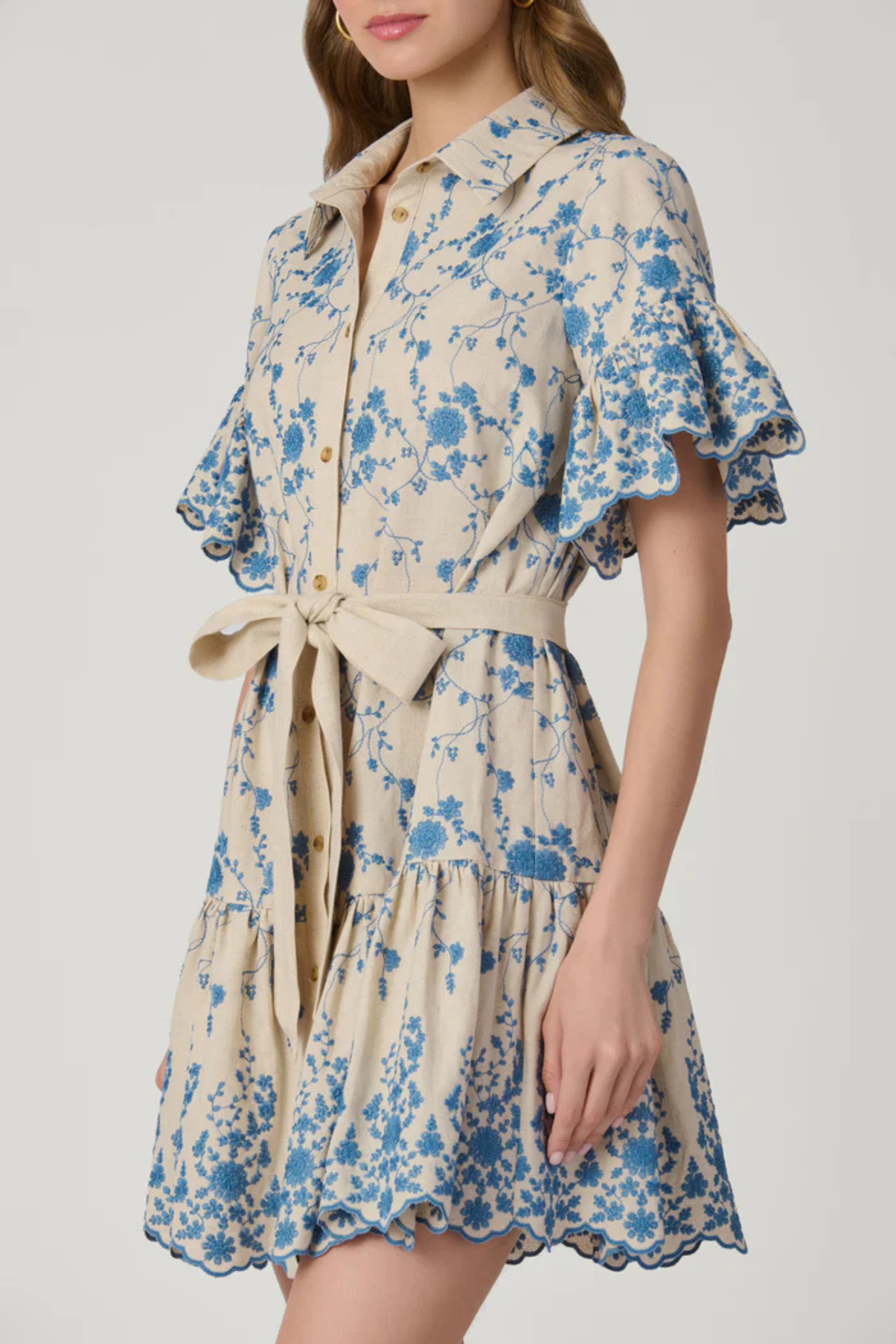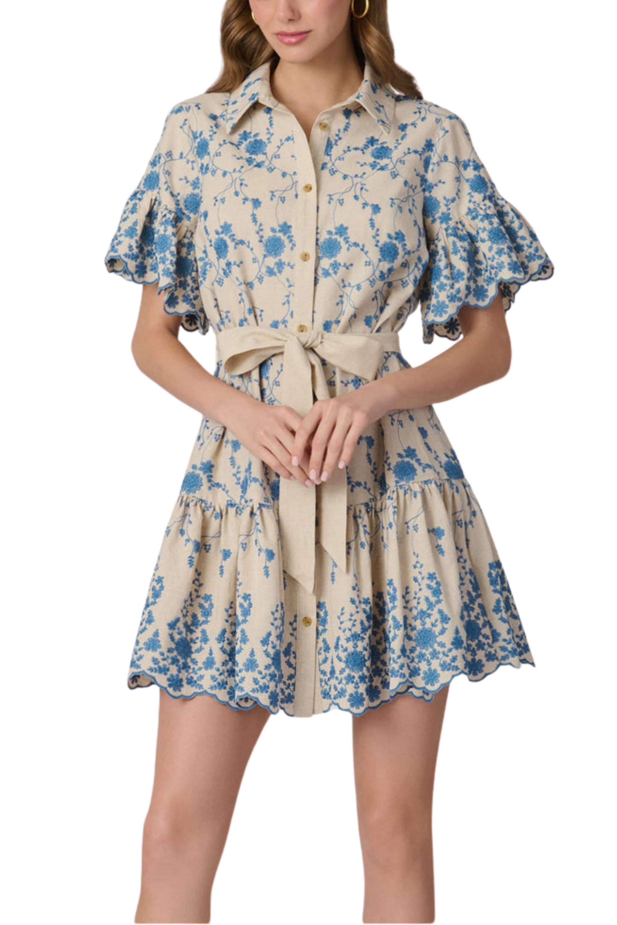 This shirtdress is made in a beautiful embroidered linen fabric. The button-front dress has a waist tie to add definition. Ruffle details at the sleeves and hem are finished with the fabric’s gorgeous scalloped edge. Unlined. Front button closure.