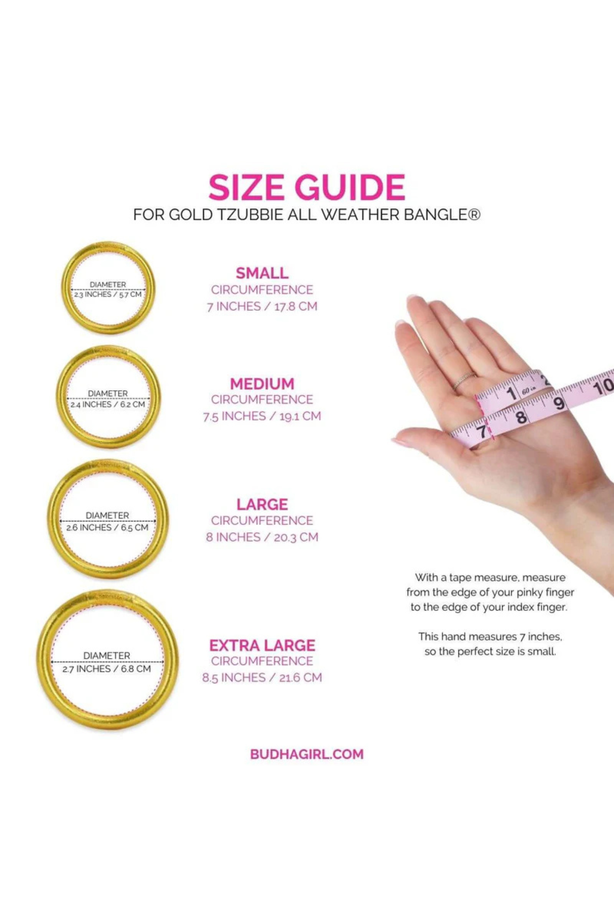 Bold, radiant, and timeless, the Tzubbie All Weather Bangle in Gold from BudhaGirl brings effortless glamour to your everyday jewelry stack. This statement version of BudhaGirl’s iconic All Weather Bangle features a luminous gold tone encased in smooth tubing, creating a rich, polished finish that instantly elevates any look. The Tzubbie bangle is designed to stand out—perfect worn alone for a bold minimalist statement or layered with other AWB bangles for a dramatic stack. Like all BudhaGirl All Weather Bangles, it is lightweight, waterproof, soundless, and TSA-proof, making it ideal for travel, workouts, and daily wear. Handcrafted in Thailand by skilled artisans, each piece reflects BudhaGirl’s philosophy of mindful luxury. Slip it on as part of your daily ritual and set your intention for the day ahead.