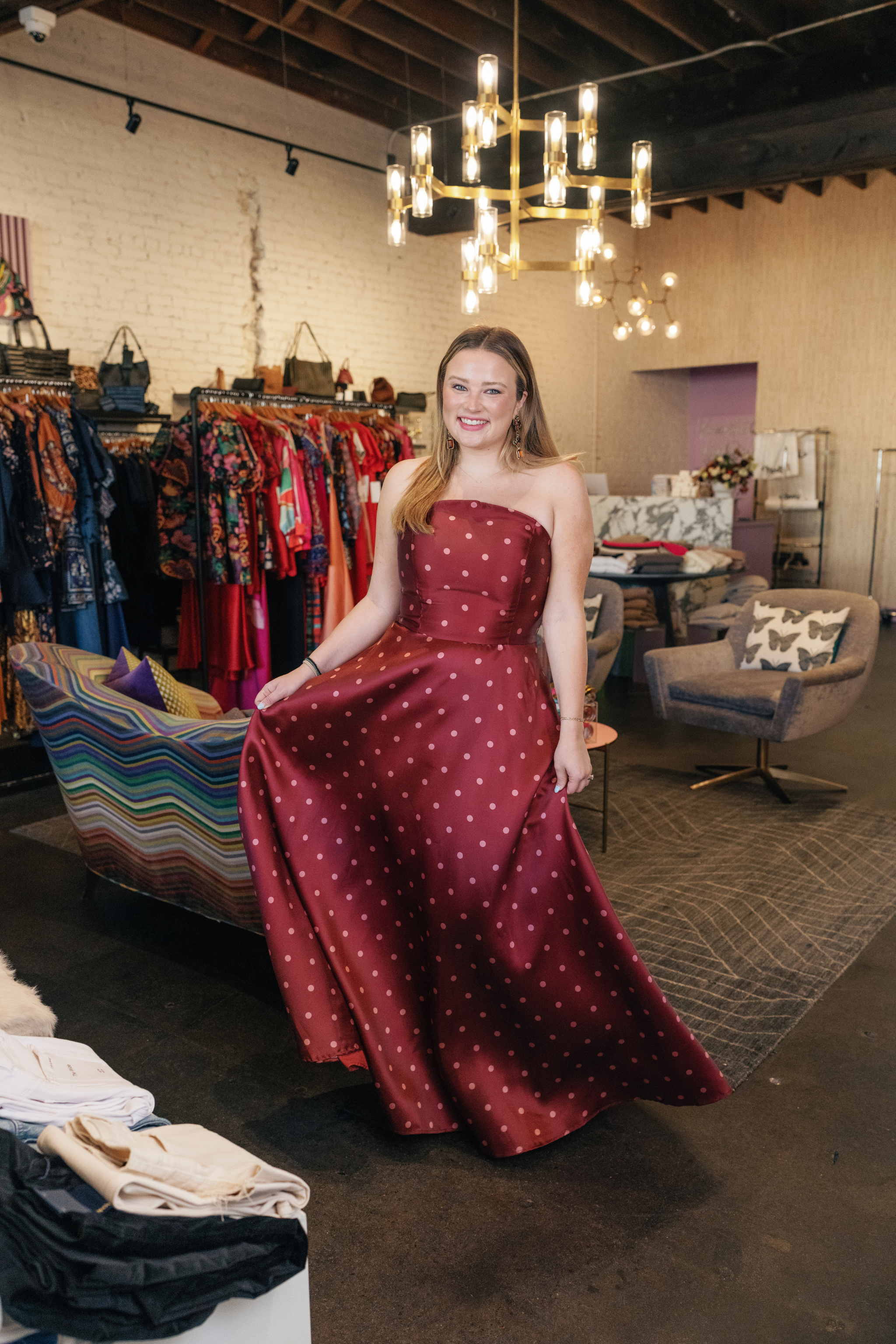 The Victoria Dress in Pomegranate Polka Dot from Hutch.