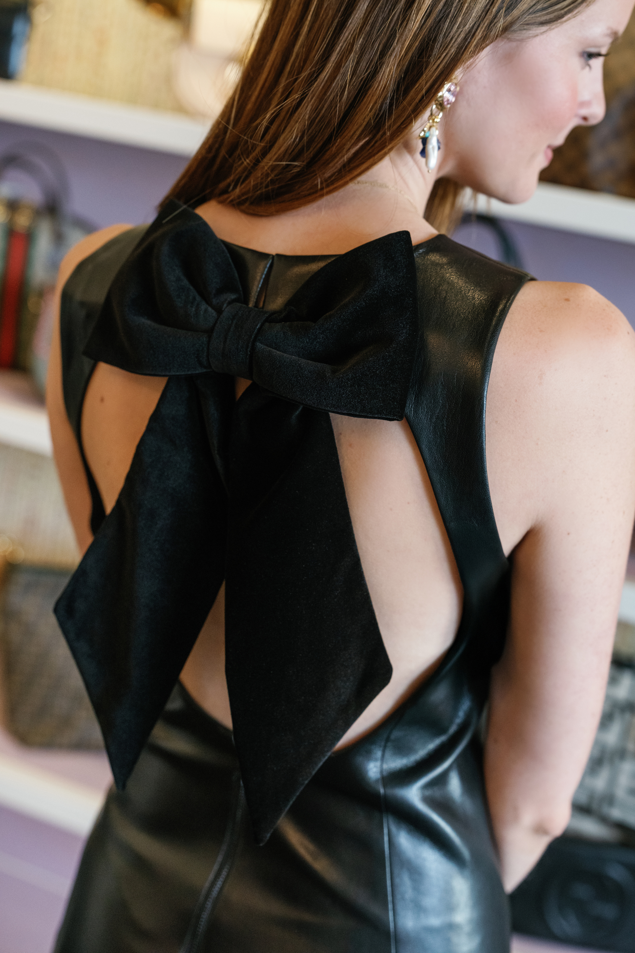 Crafted of smooth faux leather, the Wynell midi-dress from Alice + Olivia is designed with an open back and velvet bow.