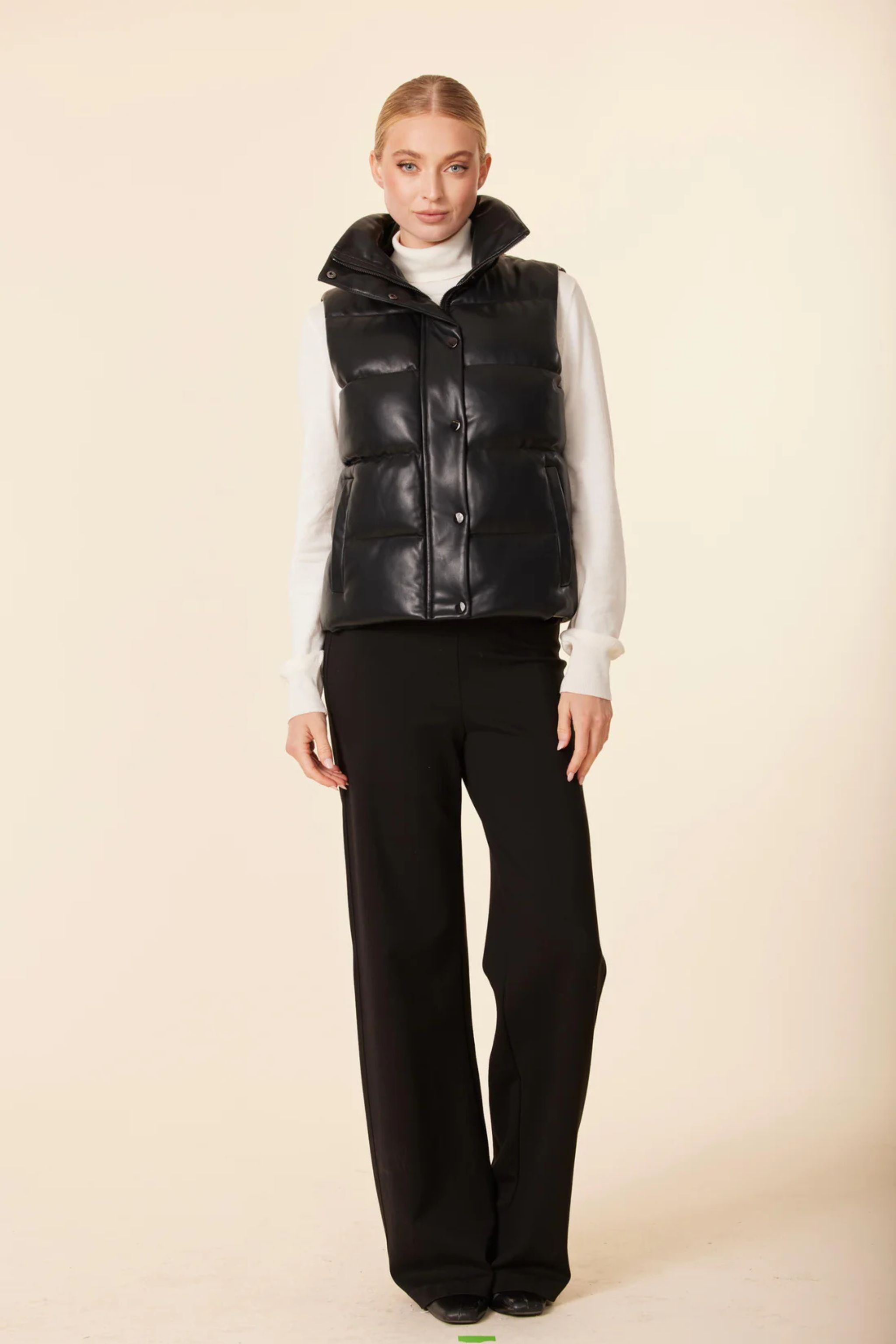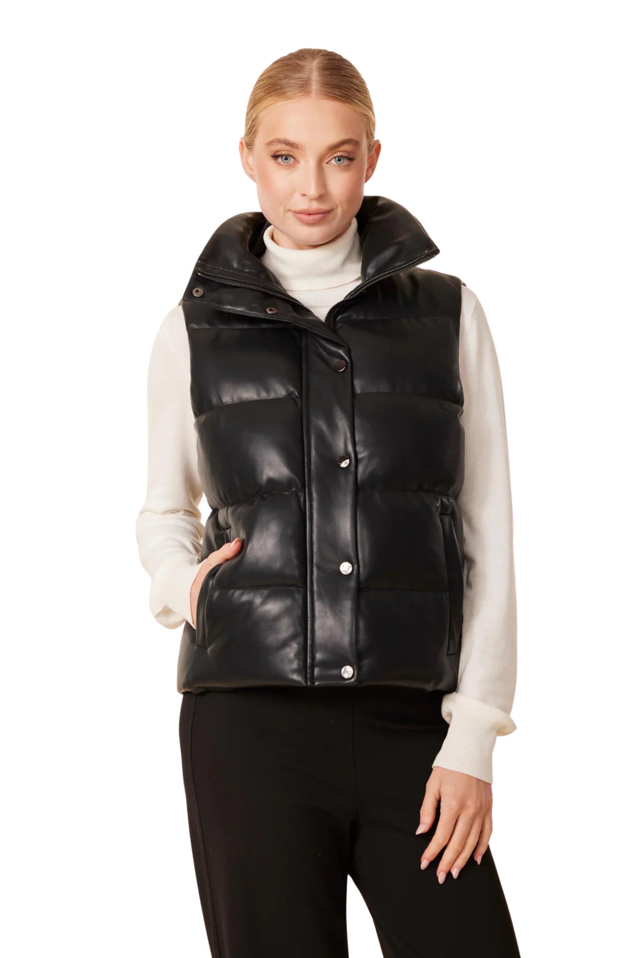 Stay warm and on-trend this Fall with Dolce Cabo's faux leather puffer vest, featuring a high stand collar, snap-button closure, and sleek puffer design. Perfect for layering over sweaters or knits, this cruelty-free outerwear piece combines modern casual style with cozy comfort—ideal for chic autumn and winter looks.