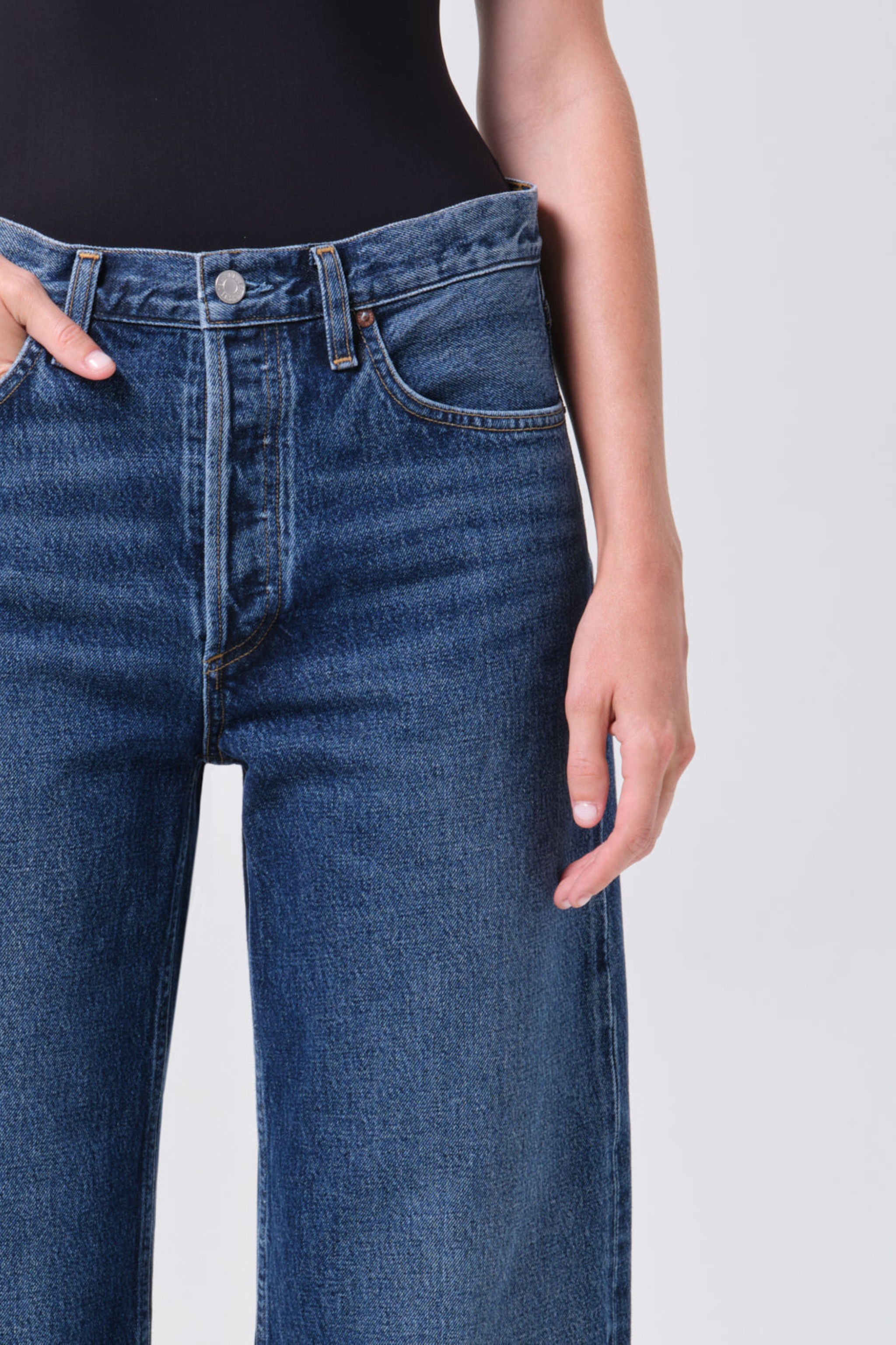 - Looks Like: Bright dark indigo denim pant