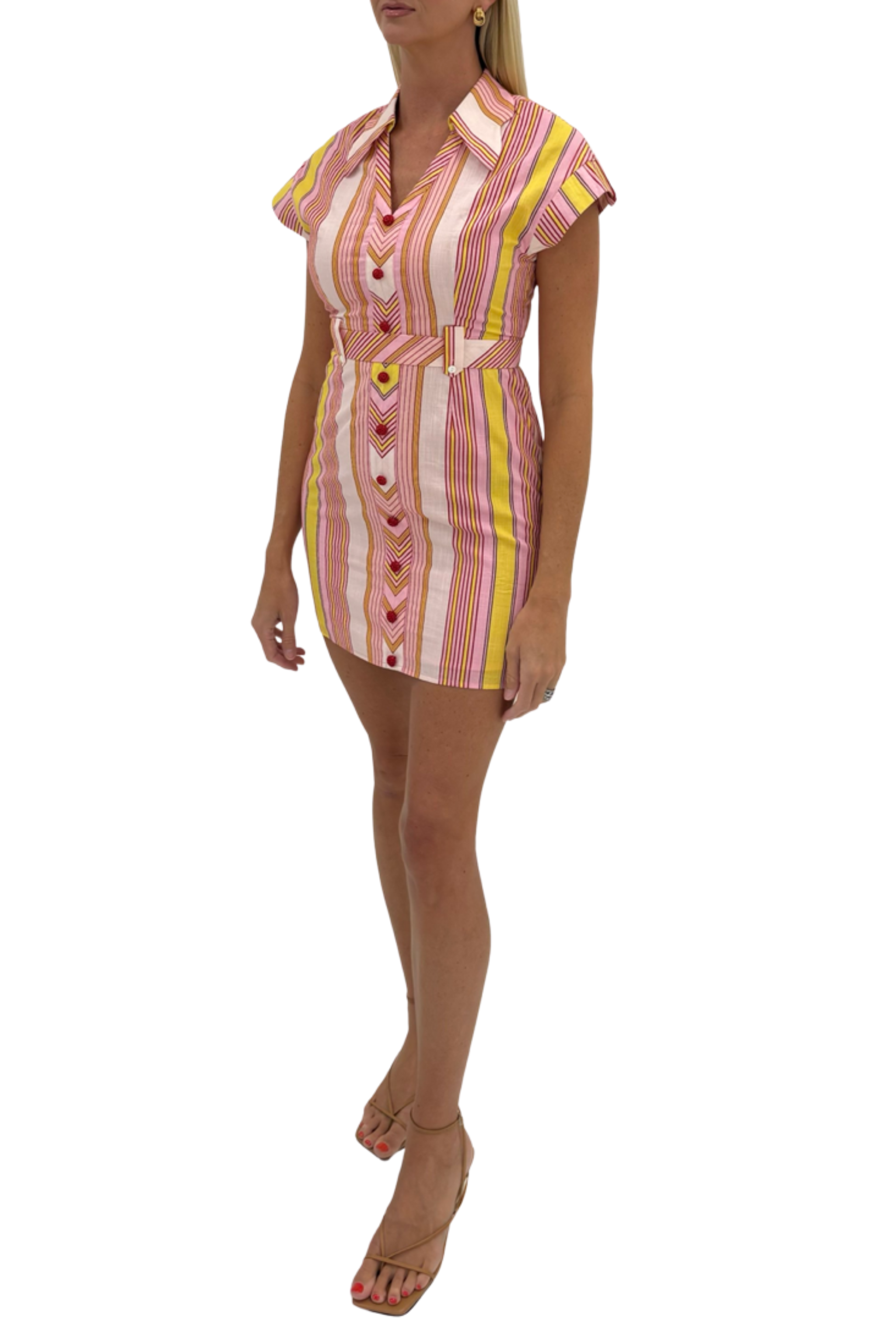Bright, playful, and polished, the Chris Dress in Candy Stripe from Anna Cate is the perfect statement piece for sunny days. This tailored mini dress features vibrant vertical candy stripes in pink, yellow, and warm tones that instantly brighten your wardrobe. A flattering belted waist defines the silhouette, while the structured collar, cap sleeves, and button-front details give the dress a classic yet modern feel.
