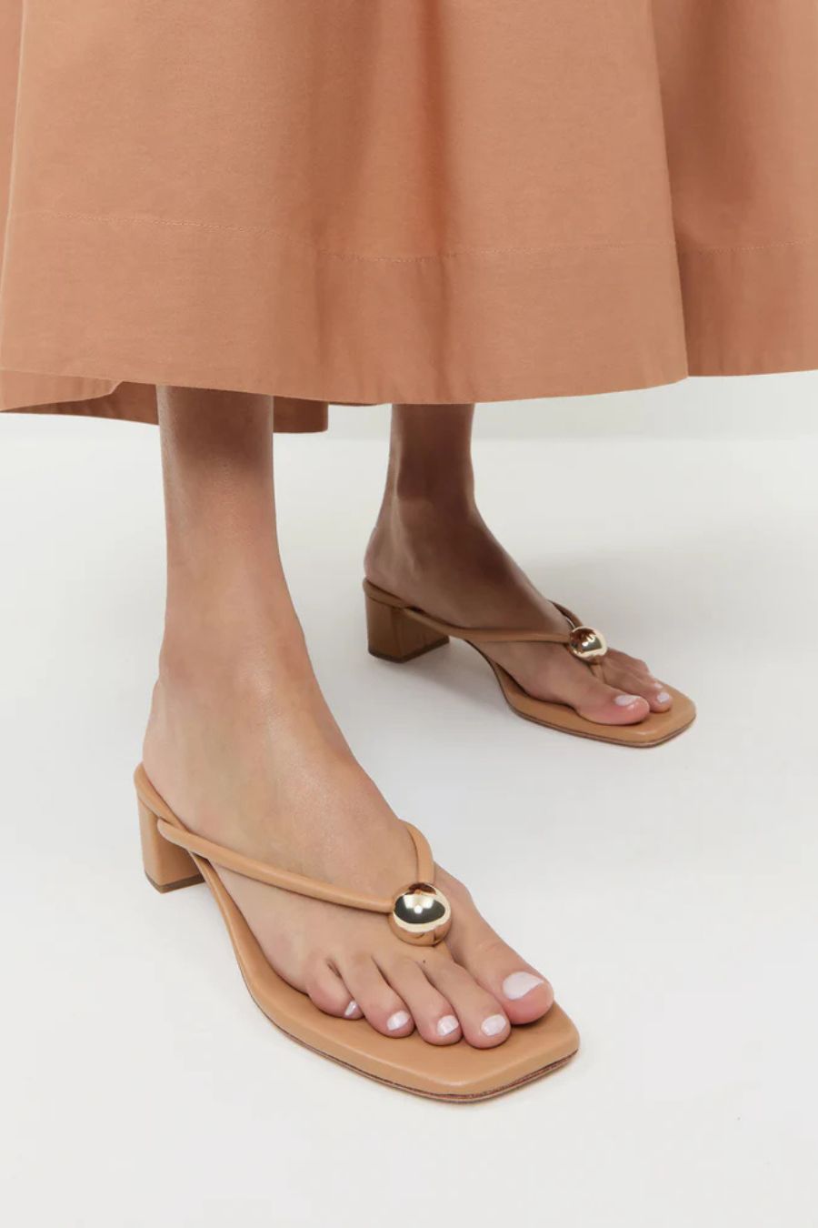 Mid-heel thong sandal in dune nappa leather. Features a statement gold ball detail and padded footbed with gold stamped logo. 2.75-inch heel. Slips on.