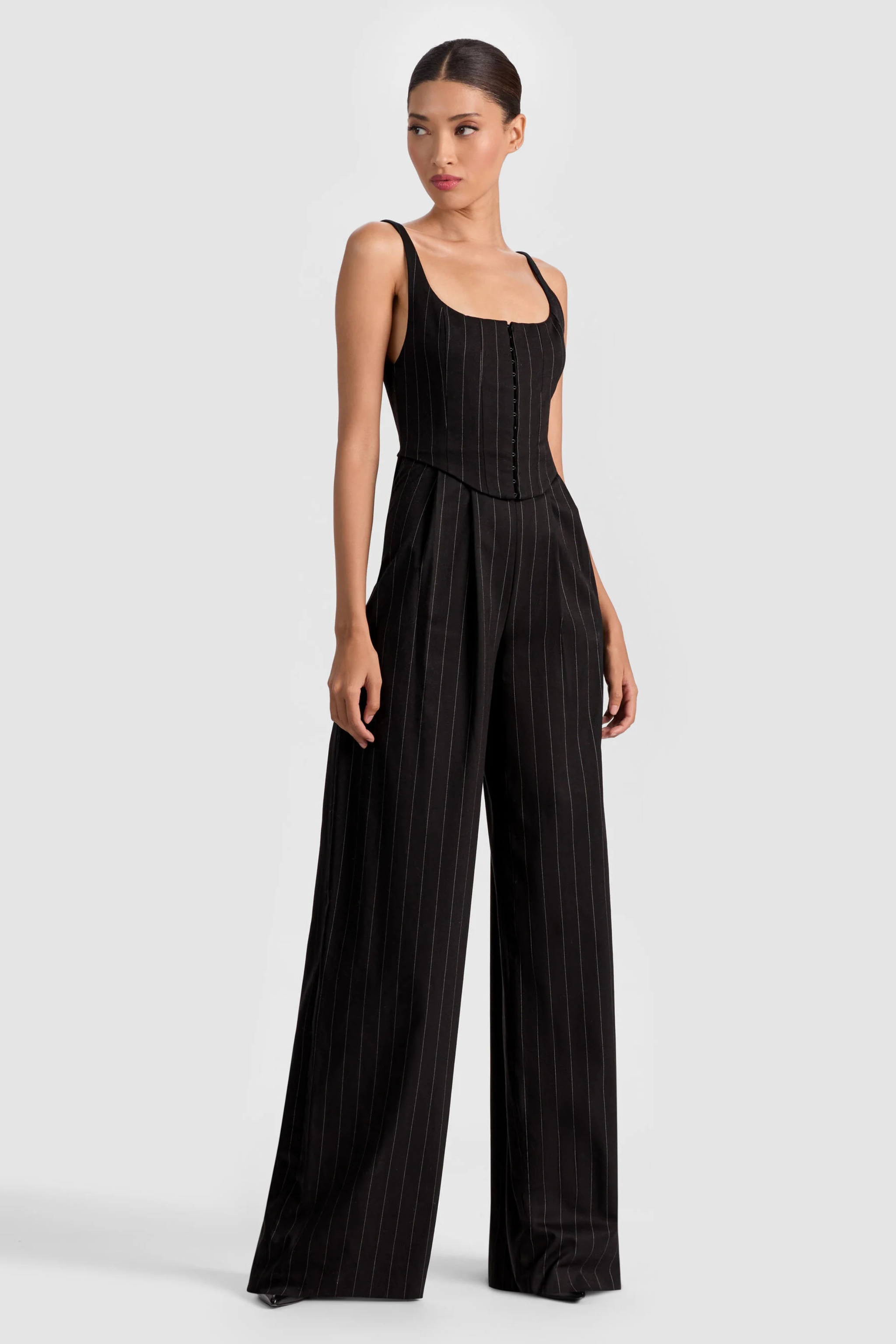 Pinstripes meet power dressing in our Rebecca, a jumpsuit that fuses corsetry with tailoring. Its bodice channels a vest with boning and hook closures, while wide-leg trousers balance structure with fluidity. A smocked back keeps the fit comfortable, making it as wearable as it is striking. Whether for the office or after hours, this one-piece delivers that perfect mix of strong, sleek, and a little unexpected.