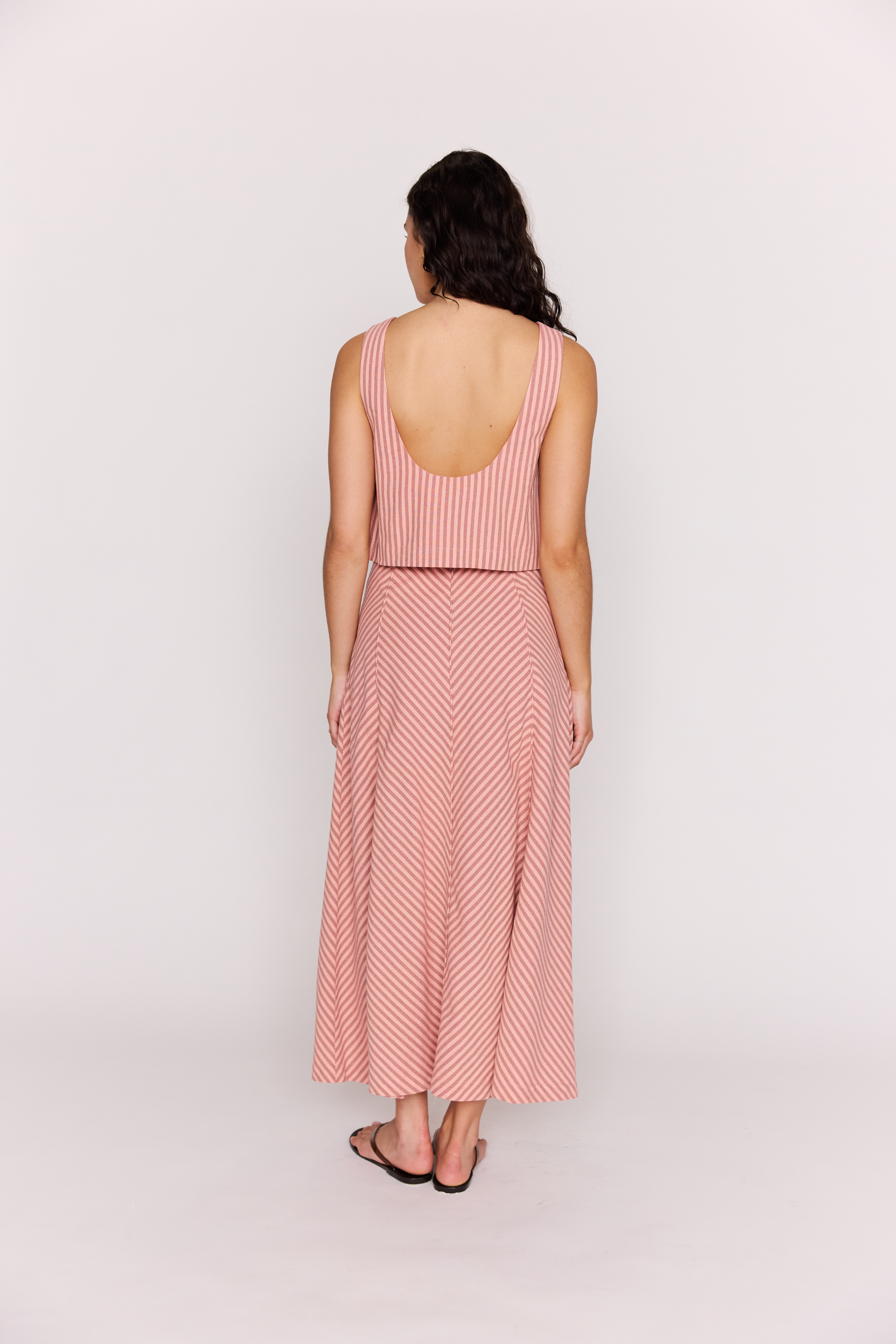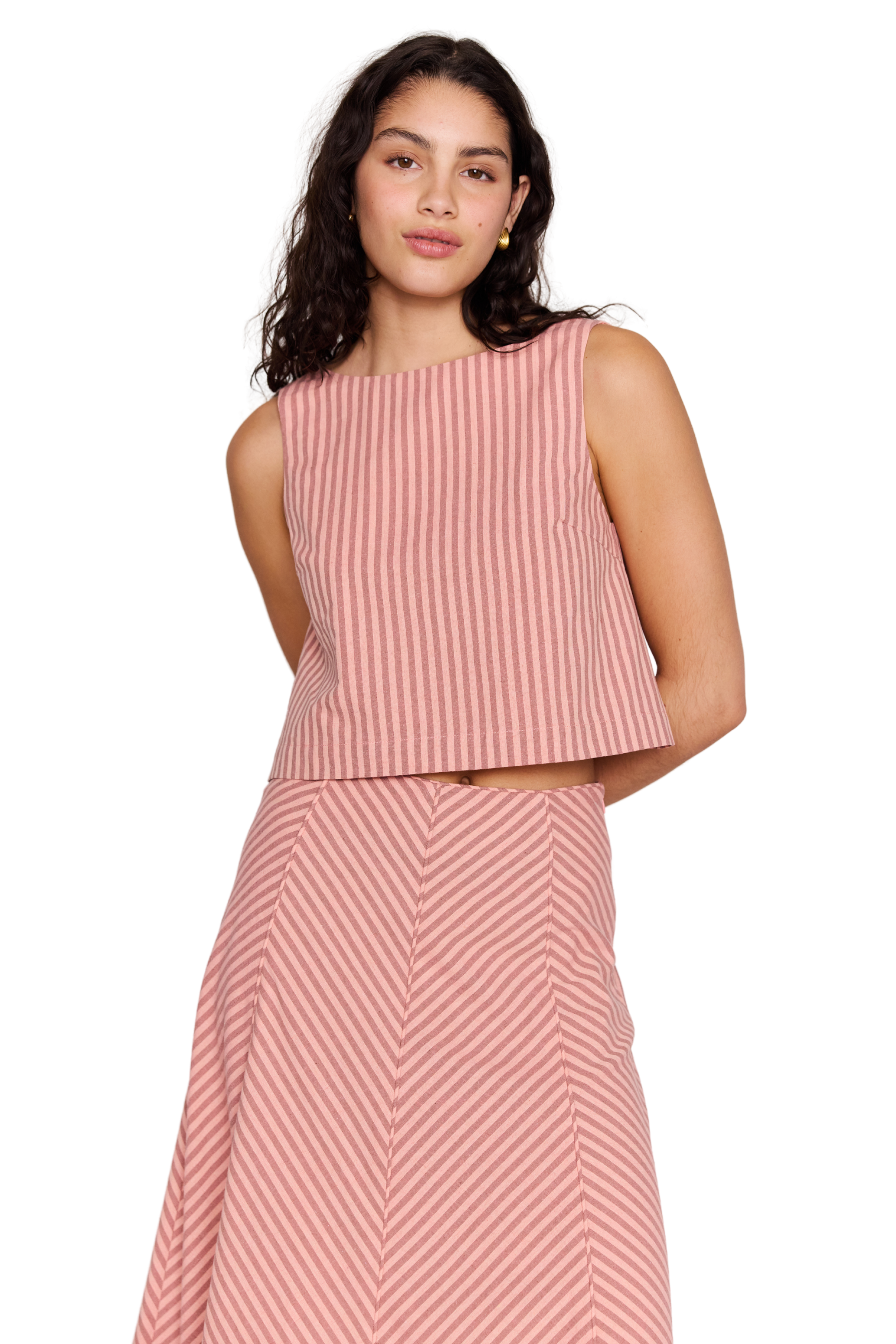 Sweet with a modern edge, the Paloma Top is your answer to effortless warm-weather dressing. Designed in a soft pink vertical stripe, this sleeveless silhouette features a clean high neckline and slightly cropped length for a flattering, easy fit. The structured cotton blend gives it shape while still feeling lightweight and breathable. Pair it with the matching Paloma Maxi Skirt for a coordinated set moment, or style it back to high-rise white denim for an easy weekend look.