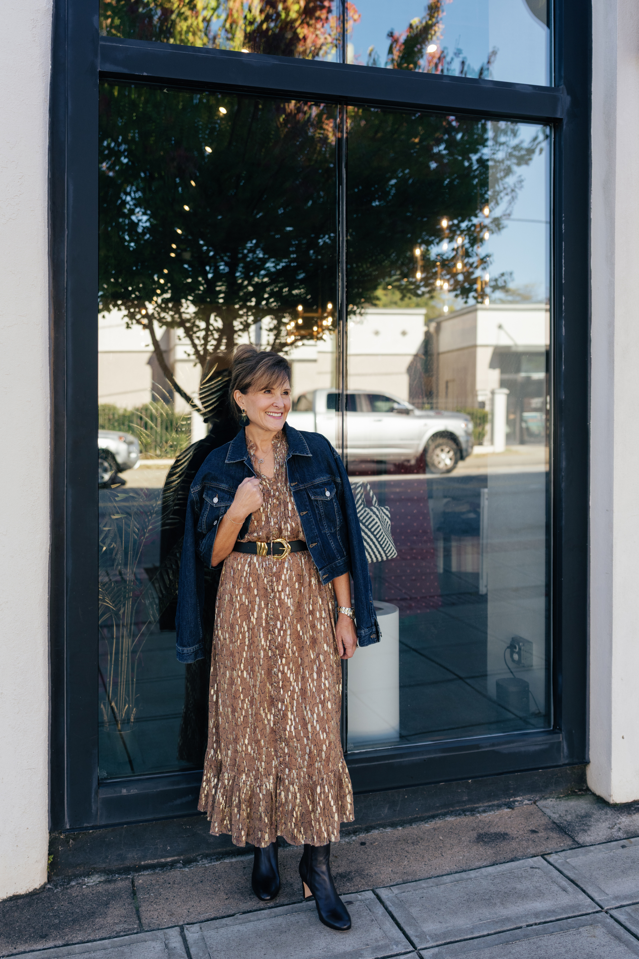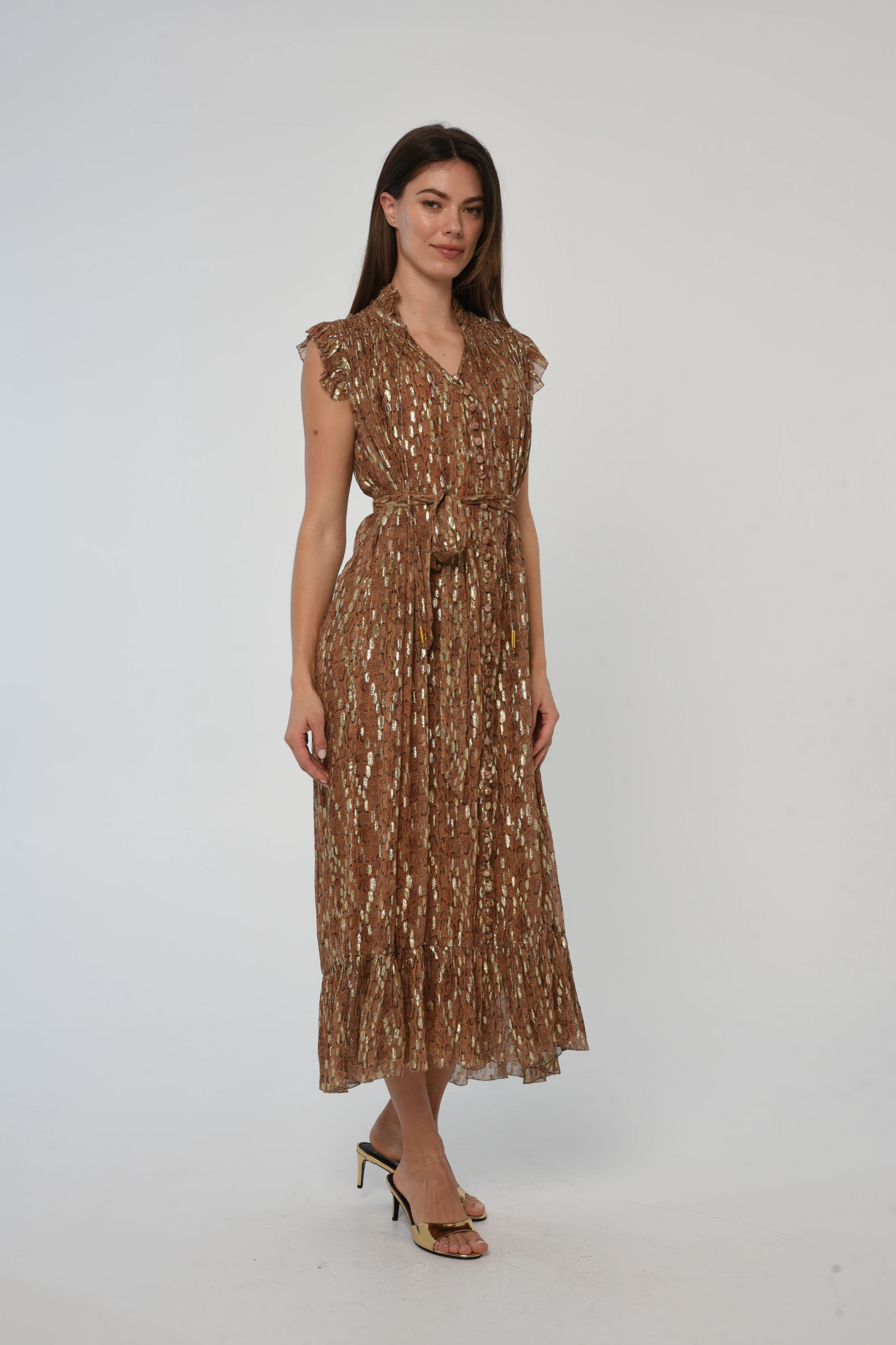 The Cassie Dress in Cavalier Python Print with gold lurex shimmer is a vintage inspired silhouette. With smocking at the shoulders and covered buttons down the center front. Wear her with the self tie at your waist for a flattering silhouette or without for a flowy look.