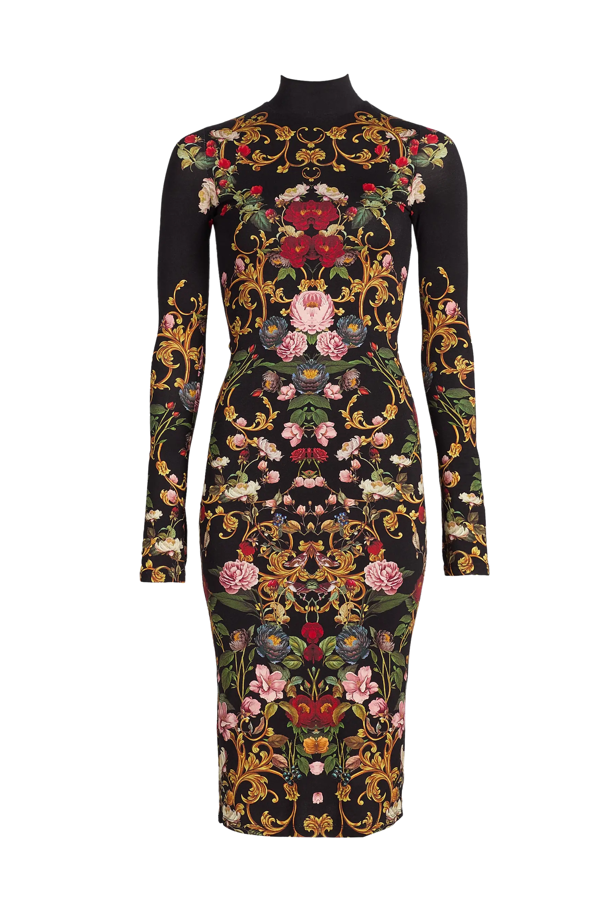 Cut in a body-con silhouette, this Delora turtleneck midi-dress from Alice + Olivia is crafted of stretch jersey. An ornate floral print adorns the long-sleeve look.