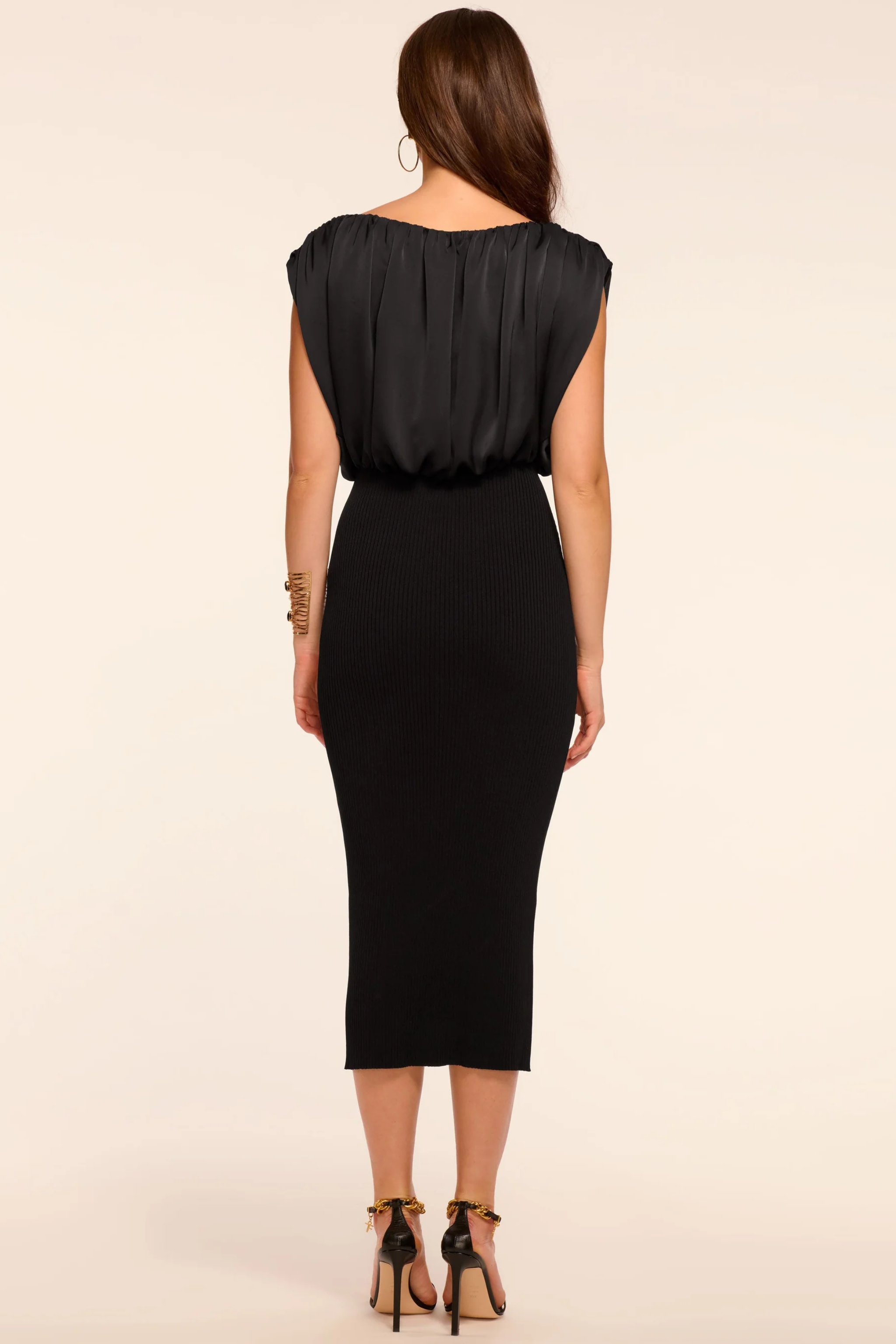 The Rochelle masters texture mixing magic with ruched satin bodice and ribbed knit skirt in perfect harmony. The combination feels special enough for date nights while staying comfortable for all-day wear.
