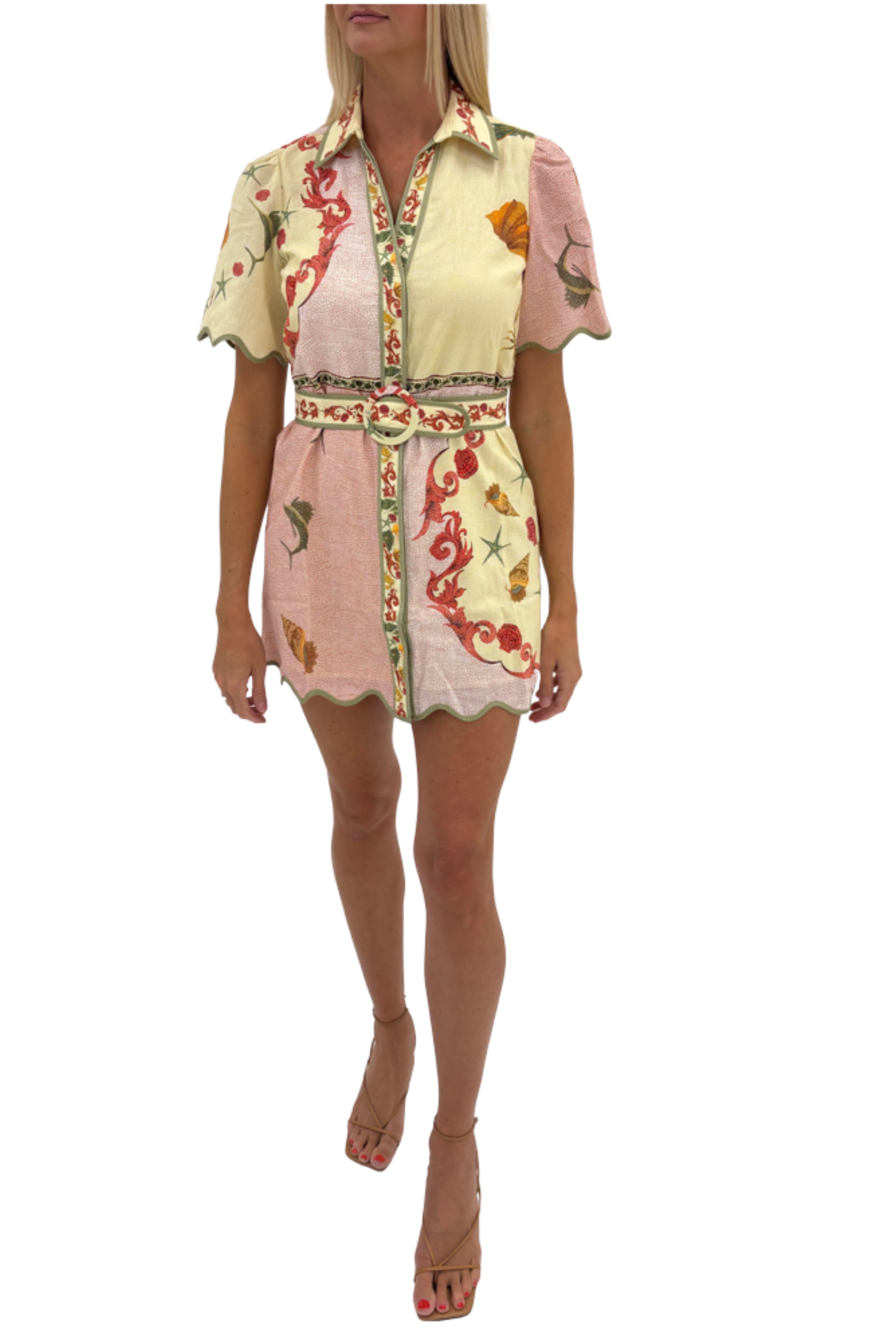 Charming and polished, the Poppy Dress in Blush Shell from Anna Cate is a statement mini dress designed for sunny days and stylish outings. This feminine shirt dress features a soft blush and shell inspired print with intricate detailing that adds a unique, elevated feel. The tailored silhouette, scalloped sleeves, and coordinating belt create a flattering shape, while the button front design keeps the look classic and versatile. Perfect for brunch, vacation dinners, and summer events, this printed mini dress brings effortless charm to any warm weather wardrobe.
