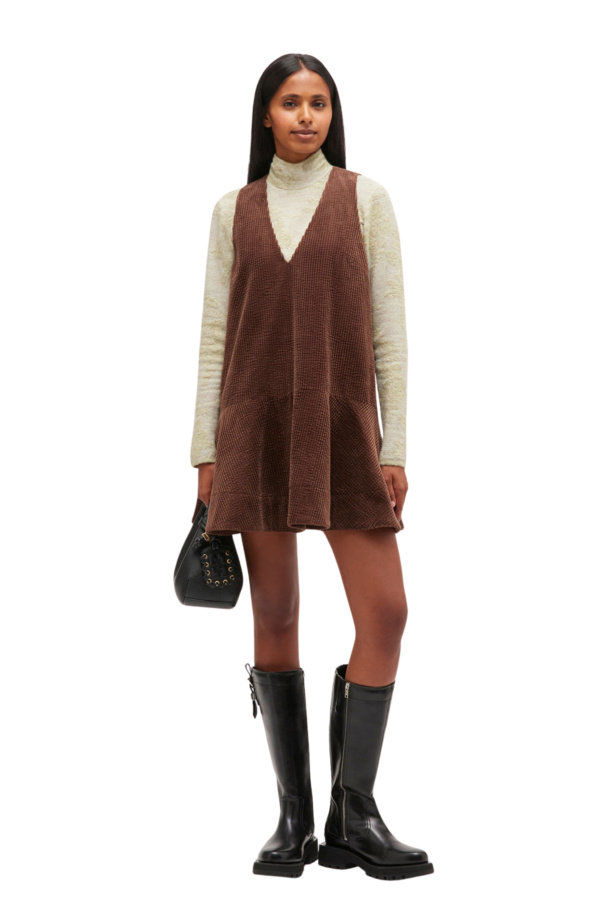 Seersucker Corduroy V-Neck Mini Dress, Chicory Coffee