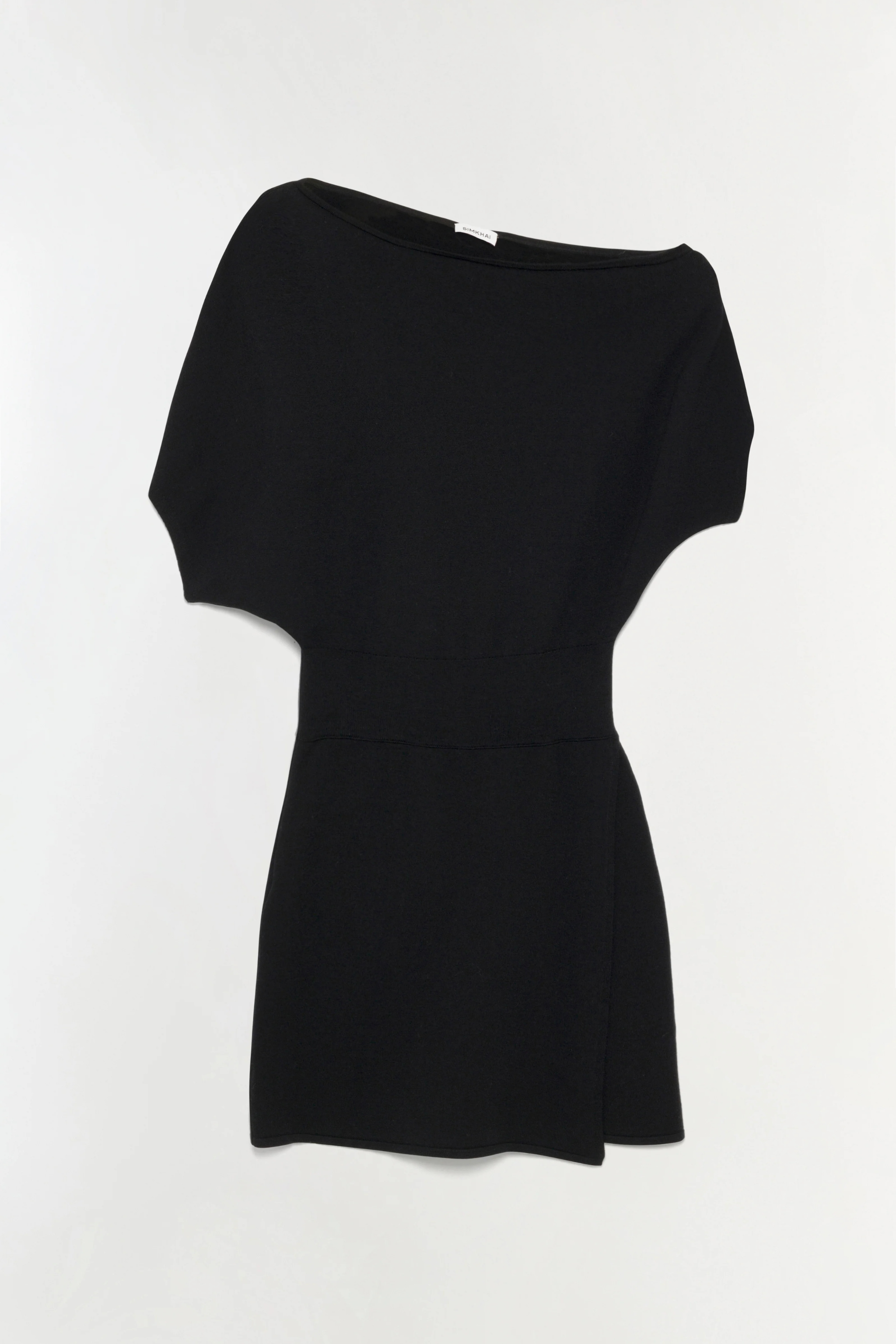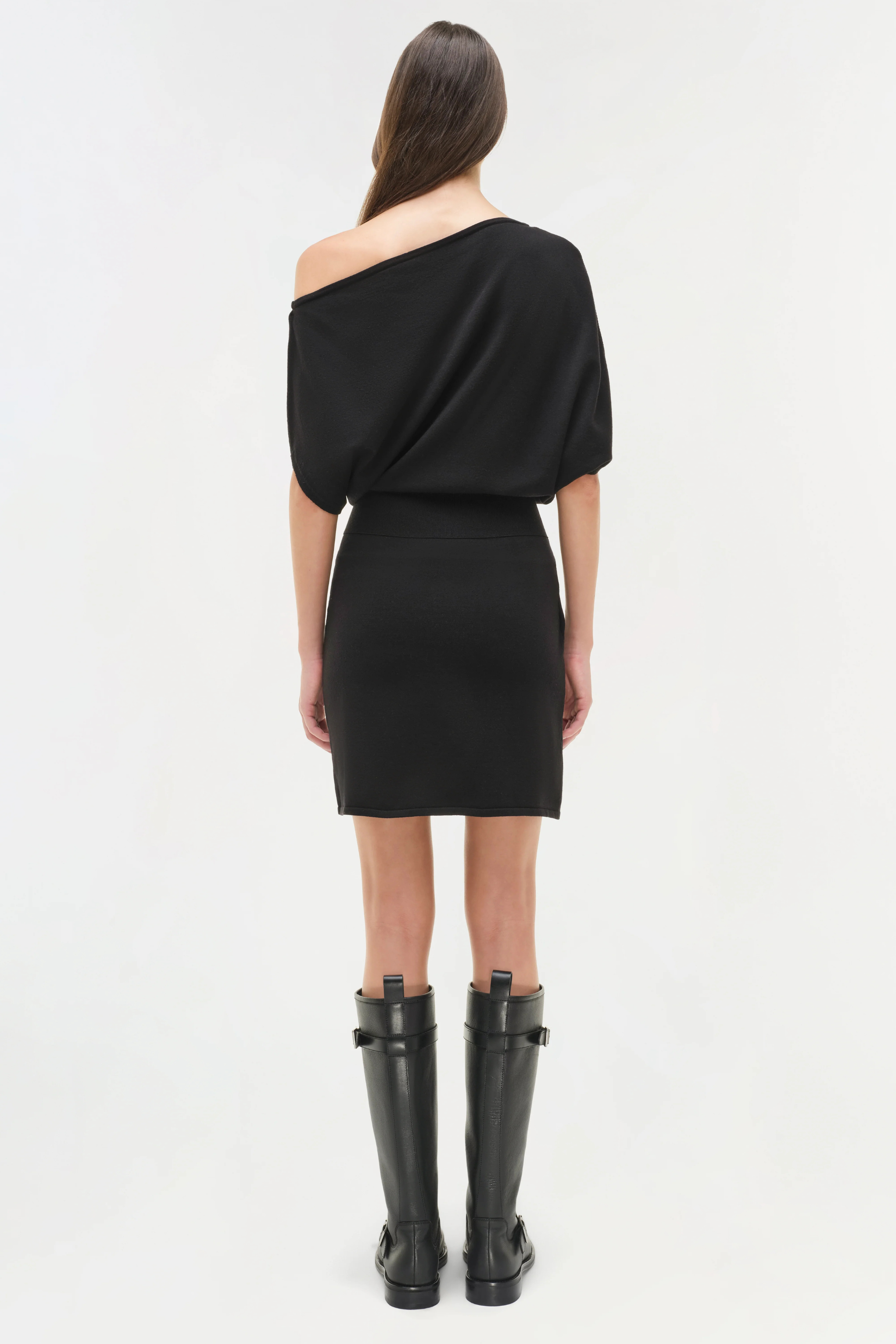 A featherweight wool mini dress in an off-shoulder construction with a voluminous top and banded waist.