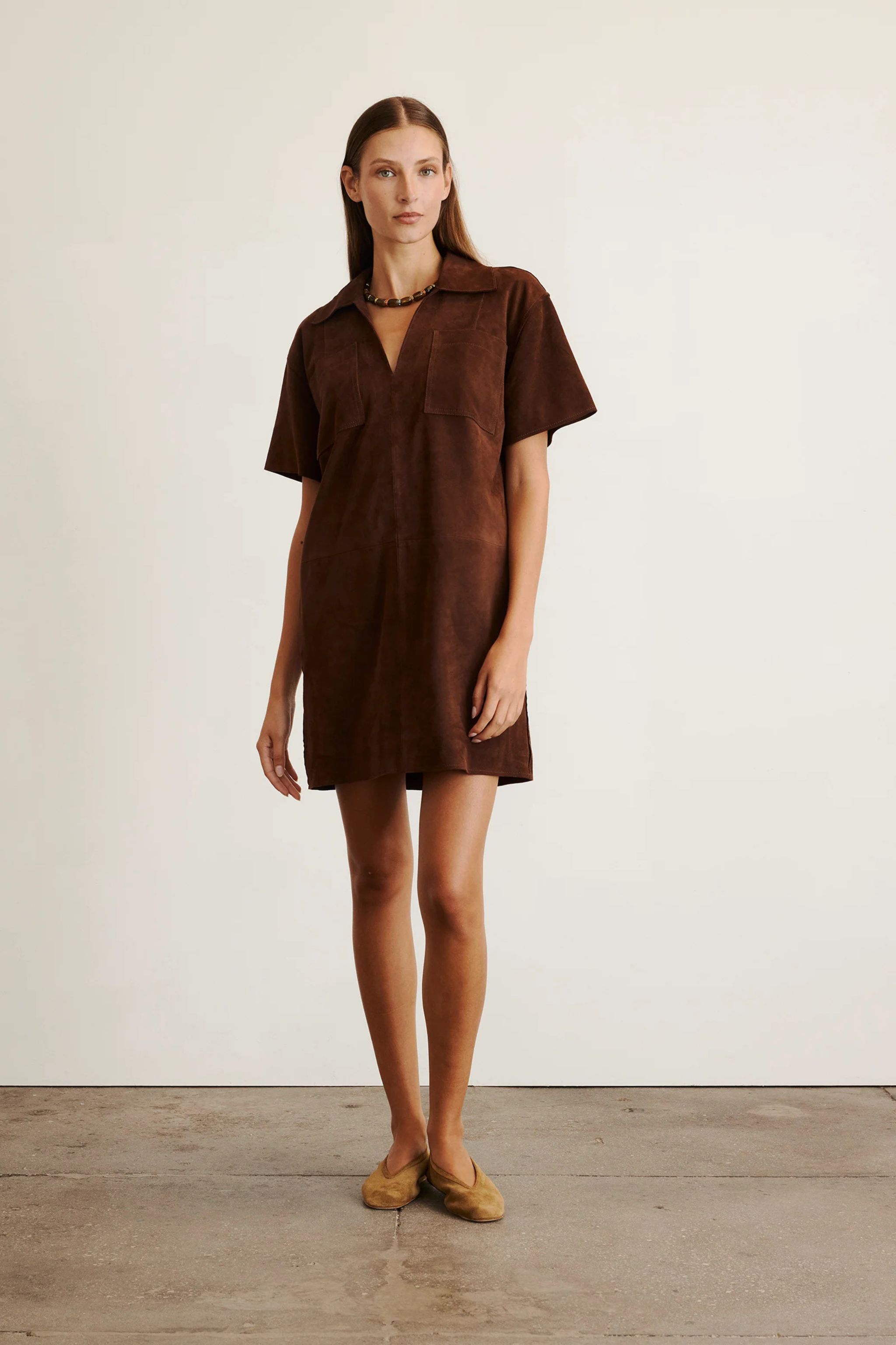 A standout silhouette of the season, the Tabby Dress is this season's must-have mini. Designed in a luxe suede leather, and featuring short sleeves, a v-neck, and a front patch pocket, Tabby is a versatile silhouette designed with a feminine ease in mind. Style it with an everyday flat for a relaxed feel that transitions you into Fall.