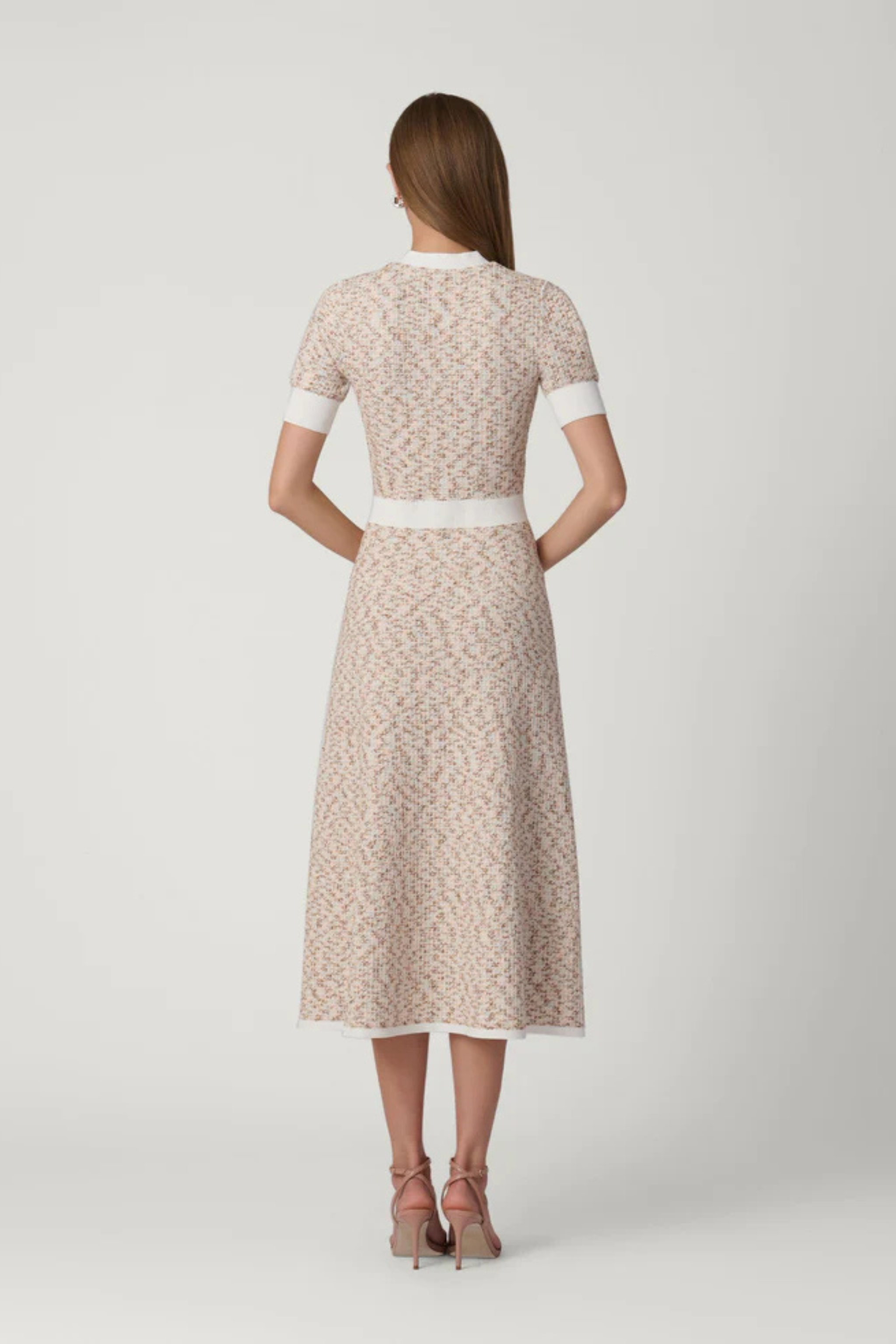 Elegant midi dress knit with a textured  “tweed” stitch detail. This yarn is soft and stretchy for a very flattering fit. The bodice and sleeves are fitted, and the skirt flares out. The top button is functional, and the other buttons are fixed. Unlined. Pull on.