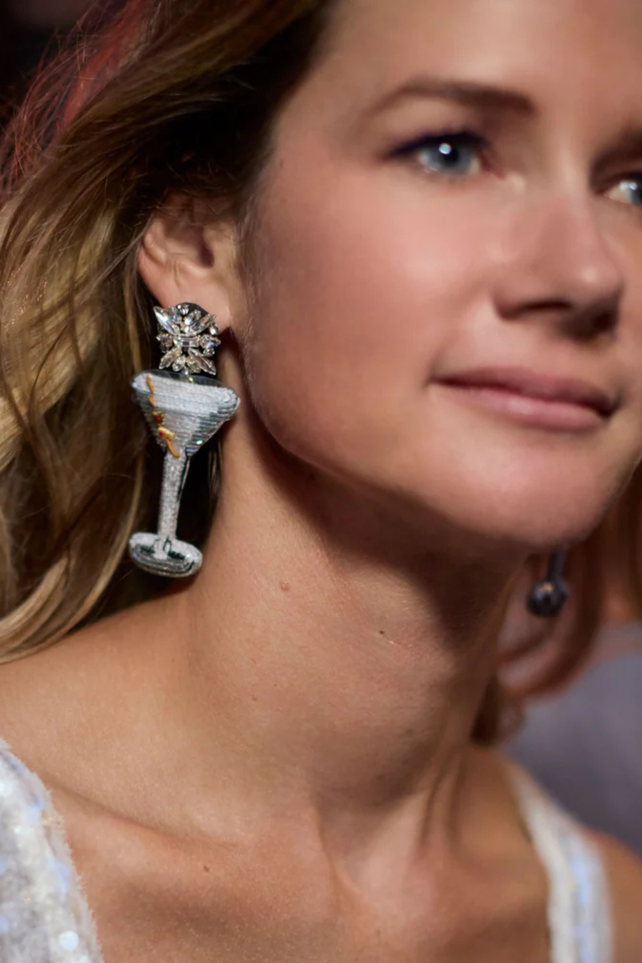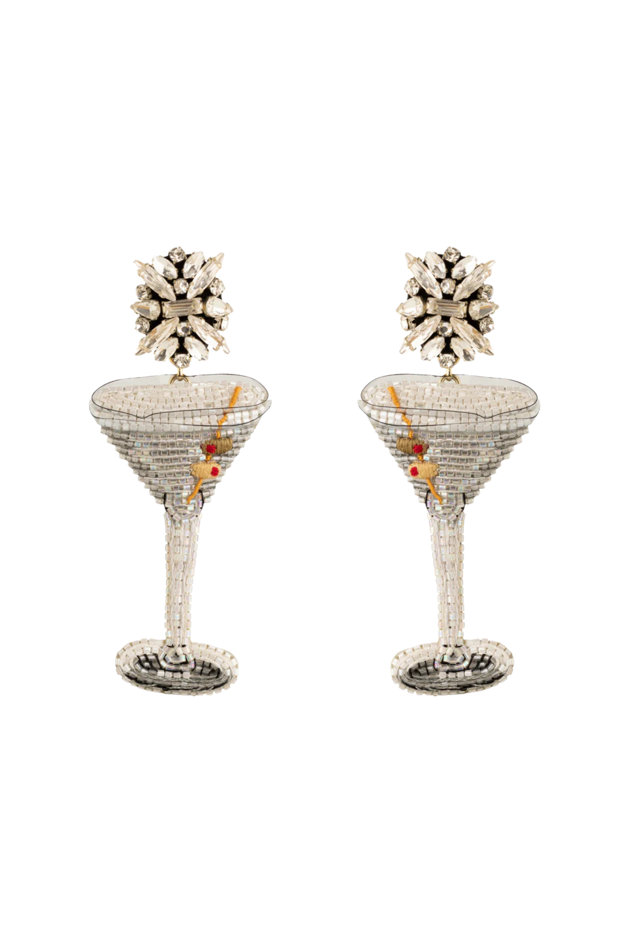 It's tini time! A tribute to the classic charm and sophistication of New York City's iconic Bemelman's Bar, these earrings feature dazzling martini glasses, complete with sparkling olive garnishes and a cascade of luxurious crystals toppers. The pair is reminiscent of the glamour and artistry found in Bemelman's murals, transporting you to an era of jazz, cocktails, and intimate conversations under the warm glow of candlelight. Slip these on for an evening out, and let their charm remind you of classic cocktails and timeless elegance.