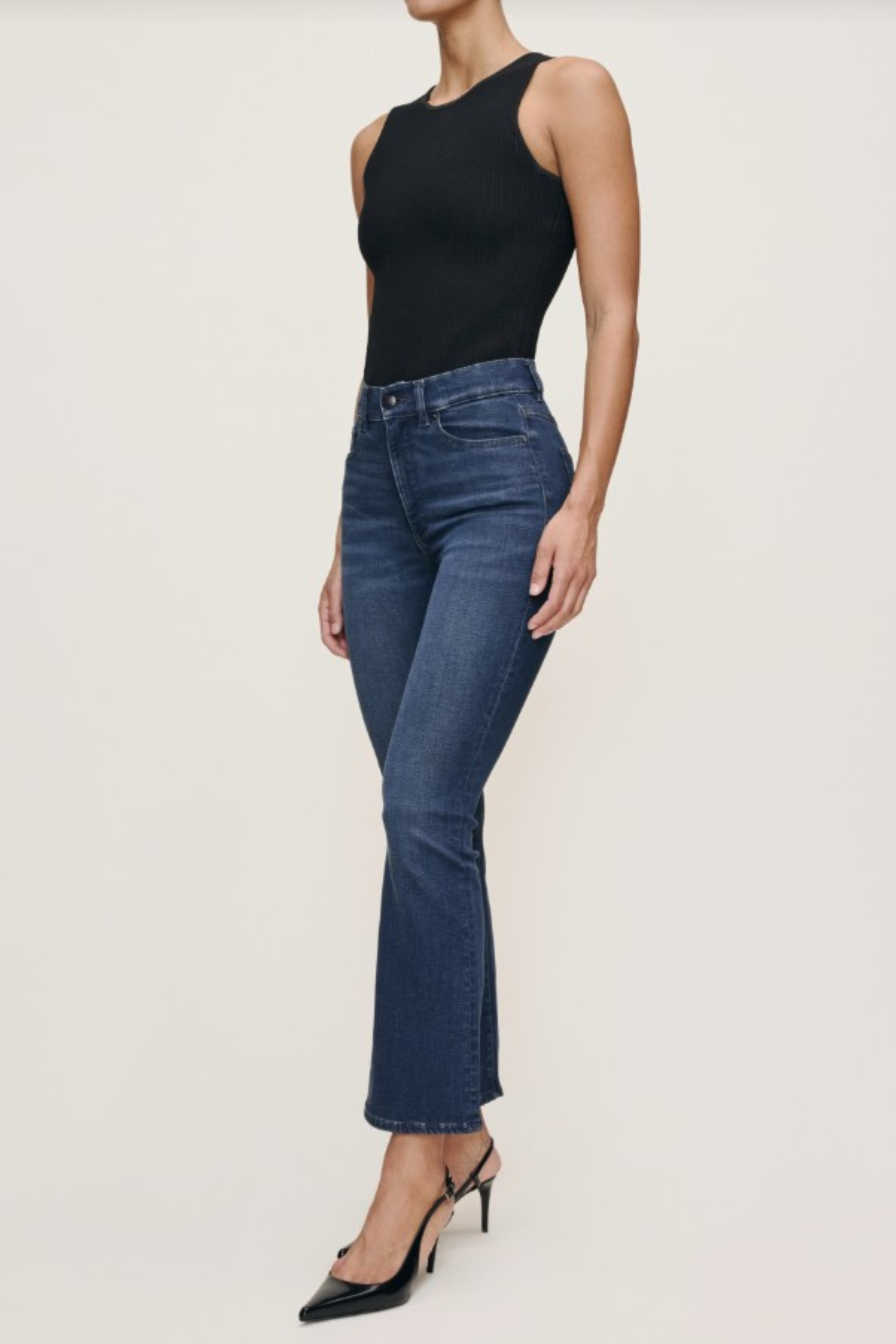 Bridget is a high-rise, cropped boot cut fit that utilizes DL1961's Instasculpt™ technology to smooth, sculpt, and conform to your body for the perfect fit. Dark Indigo is a deep, pigmented indigo wash with subtle fading. It features black hardware, dark khaki stitching, a clean hem and a black back patch.
