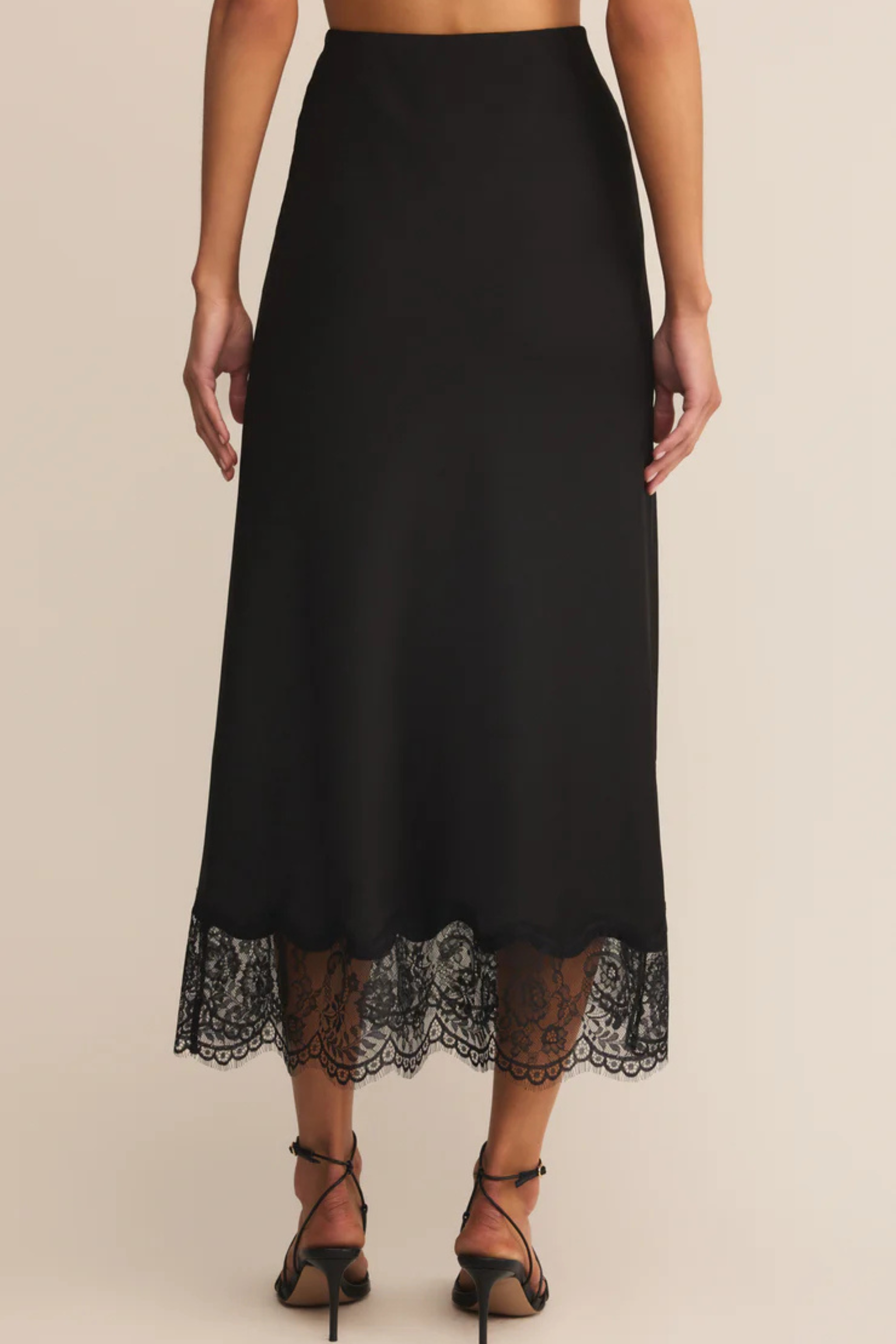Crafted from smooth, lustrous satin, this high-rise midi skirt brings an elevated touch with a scalloped lace hem. The pull-on silhouette offers comfort and polish in equal measure, perfect for holiday dinners, cocktail hours, and everything in between.