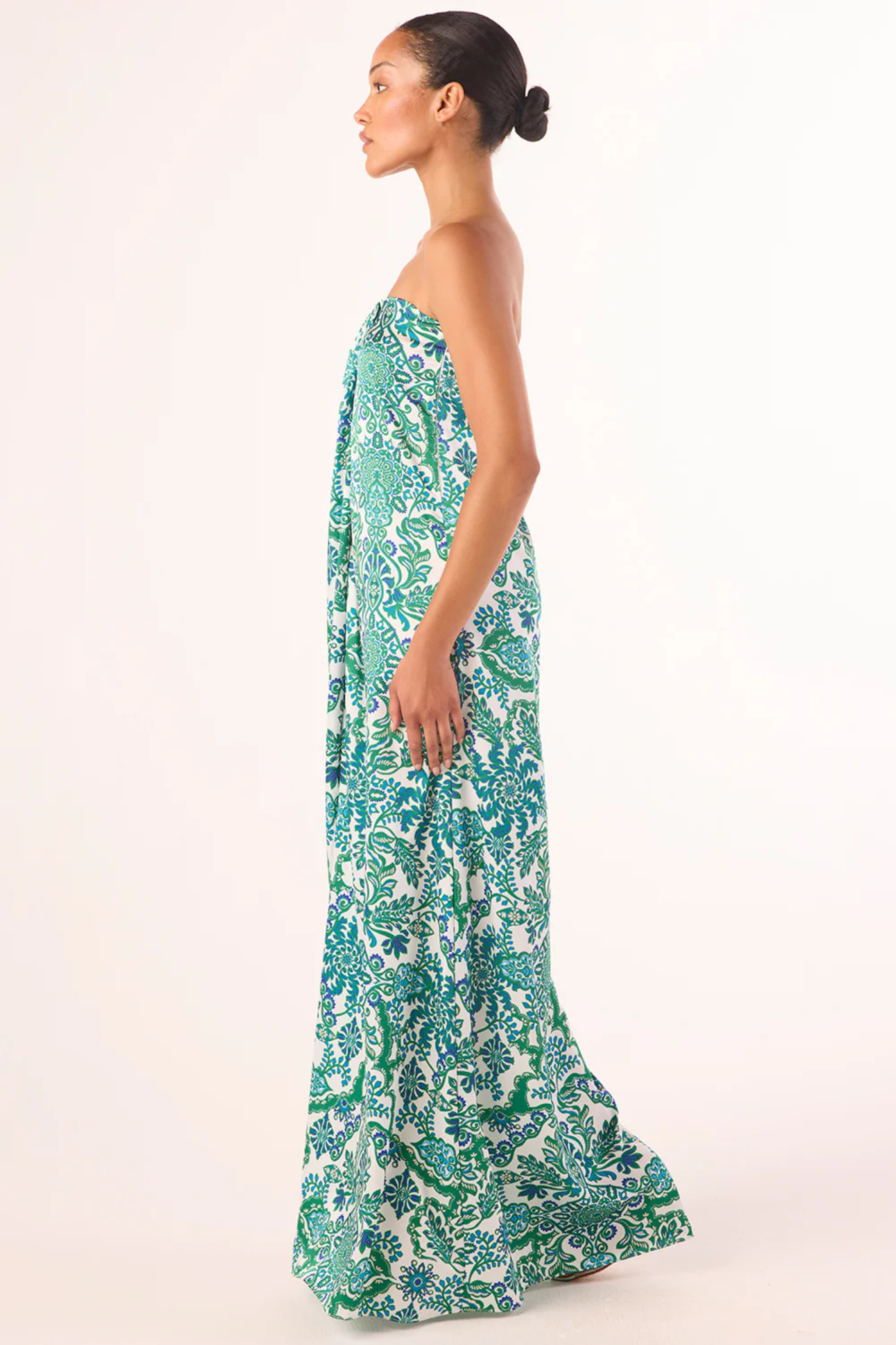 Divina is an effortlessly striking strapless maxi dress cut from fresh reflective botanical printed-satin green and blue hues. Soft front pleating enhances its clean, flowing silhouette, while a hidden side zip closure ensures a seamless fit. A versatile piece you can dress up with heels or style with flats for an easy, standout look this spring and beyond. Reflective Botanical
