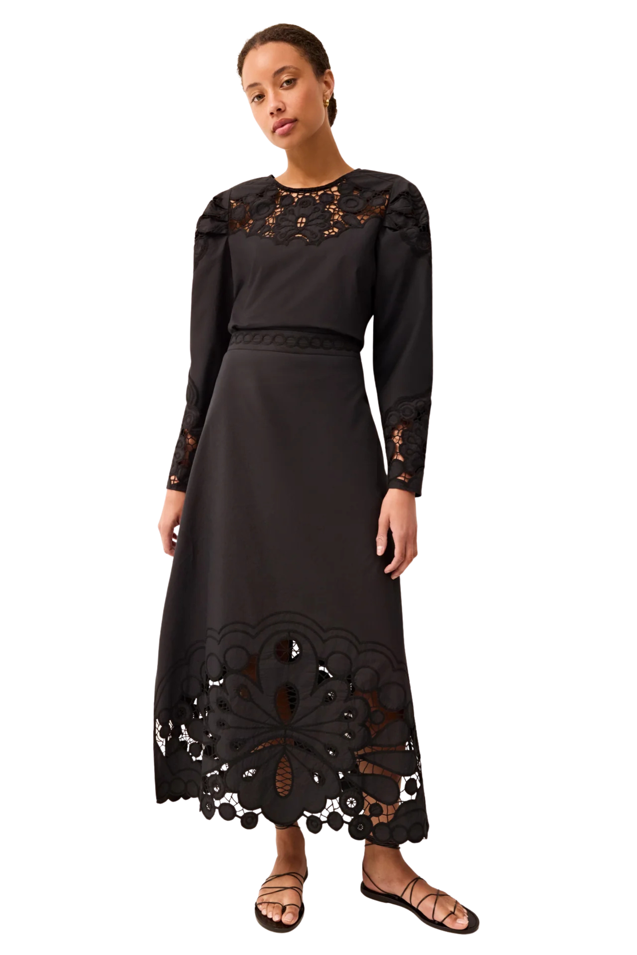 File Marie Oliver's new Eugenia skirt in Noir under items of clothing you’ll keep in your closet forever. The timeless black midi skirt is fitted through the hips and gently flares out towards a showstopping hemline that’s edged in lace embroidery.
