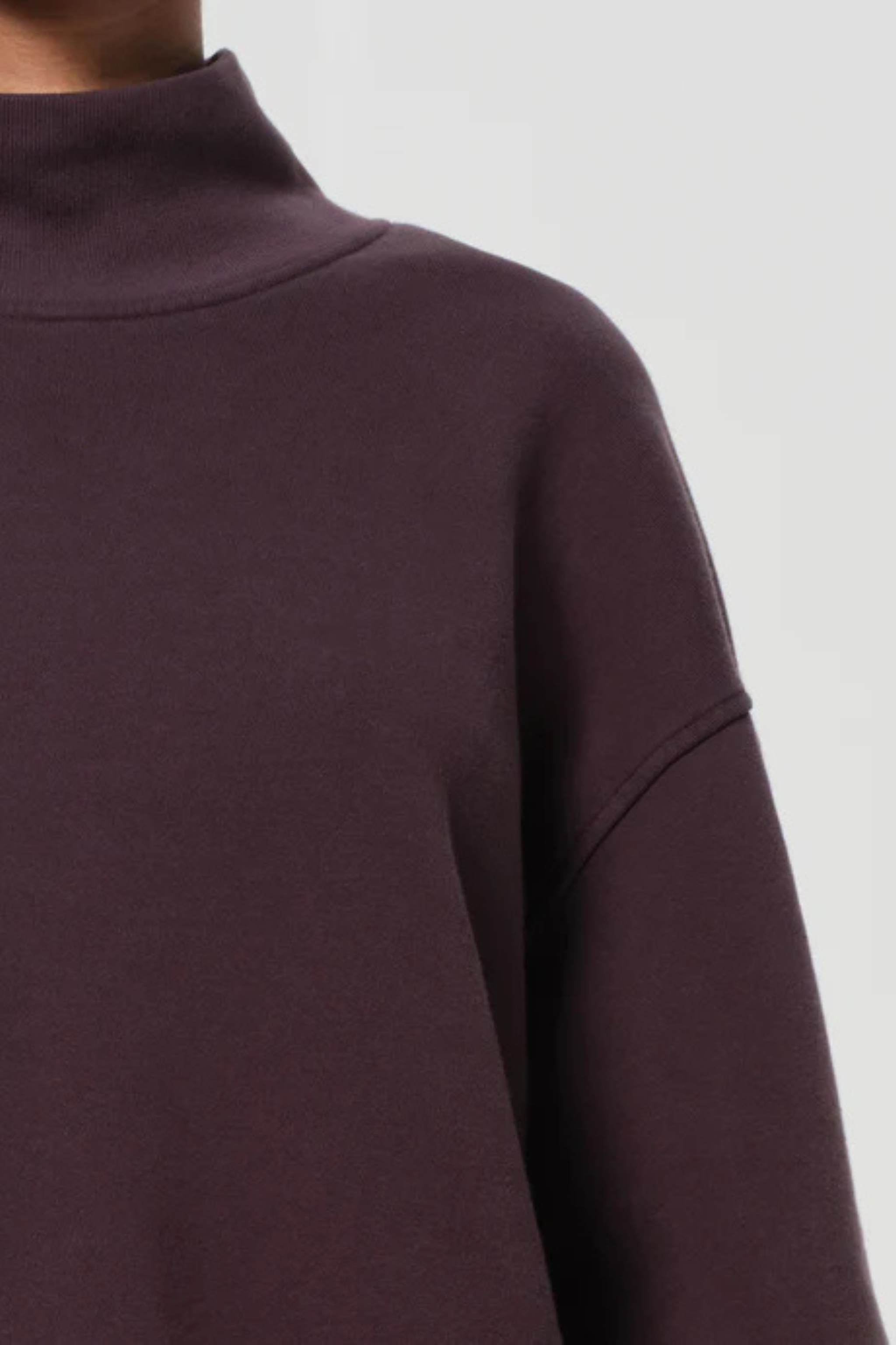 - Looks Like: Saturated dark brown relaxed mock neck sweatshirt