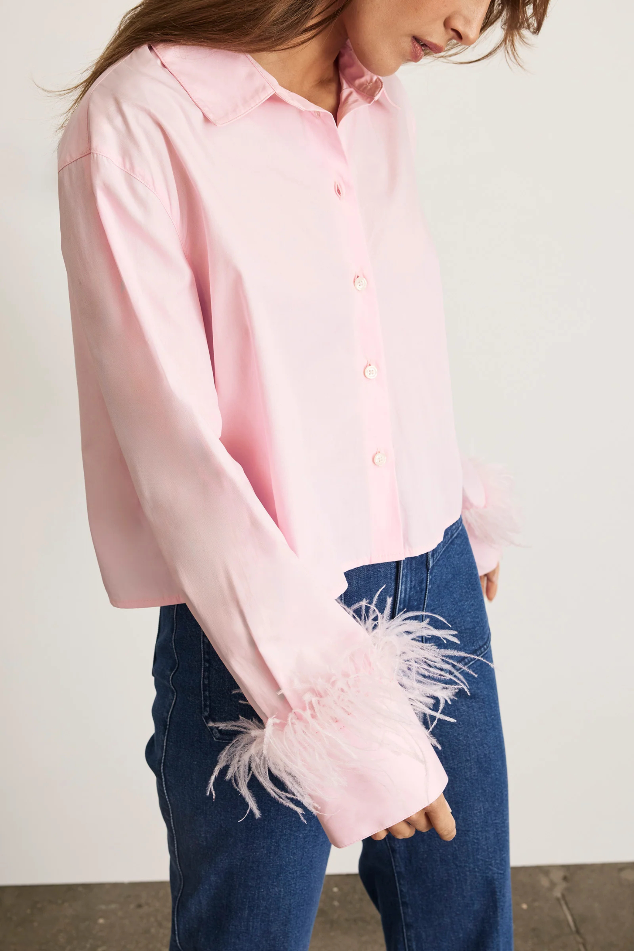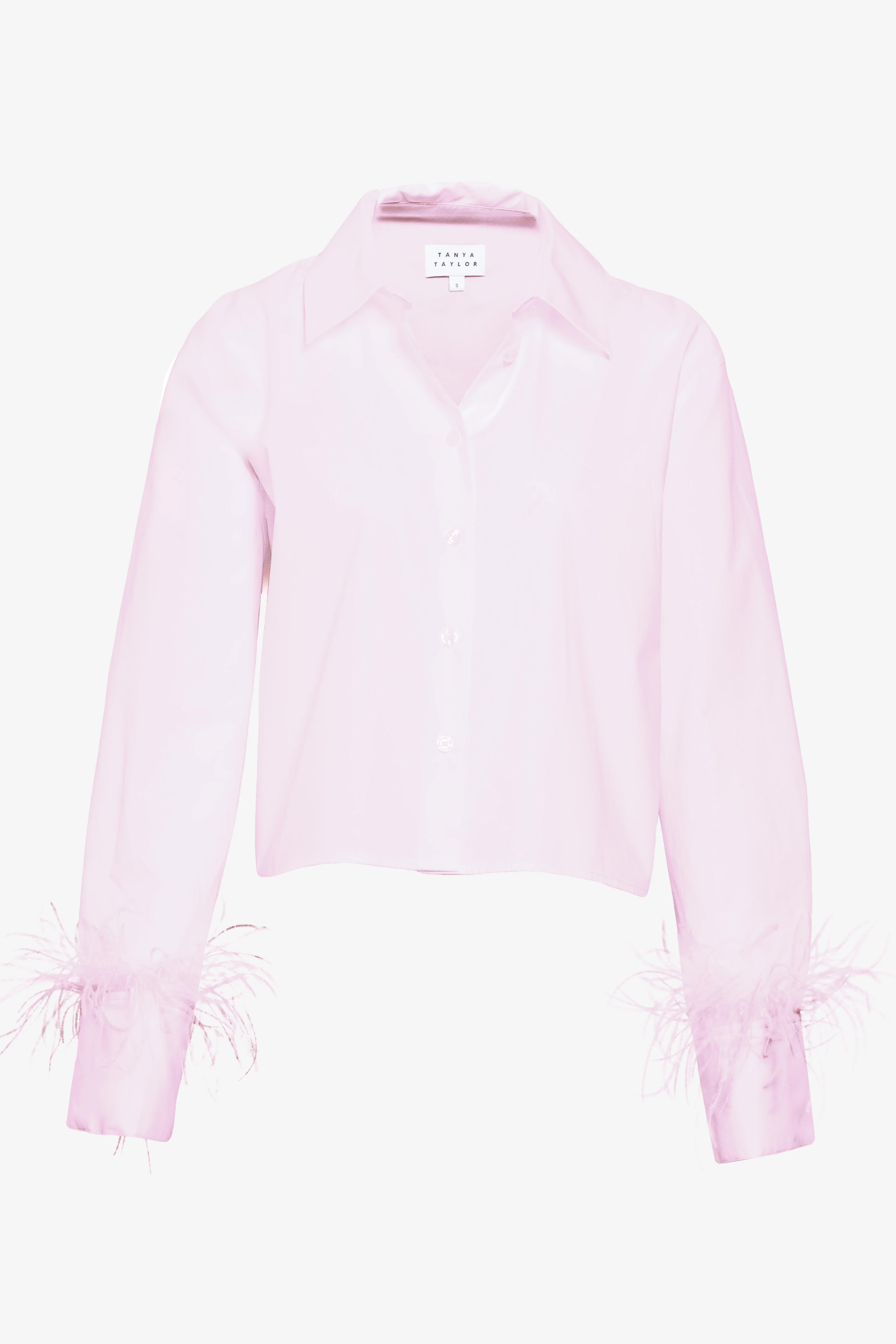 Designed in a crisp cotton shirting, the Largaux Feather Top is Tanya Taylor's take on a classic button-up shirt with a feathery twist. Featuring a collared button up, internal sleeve loops for pre-styled scrunching and a slightly cropped length, Largaux has a feminine look and feel, with feathered cuffs to stand out.